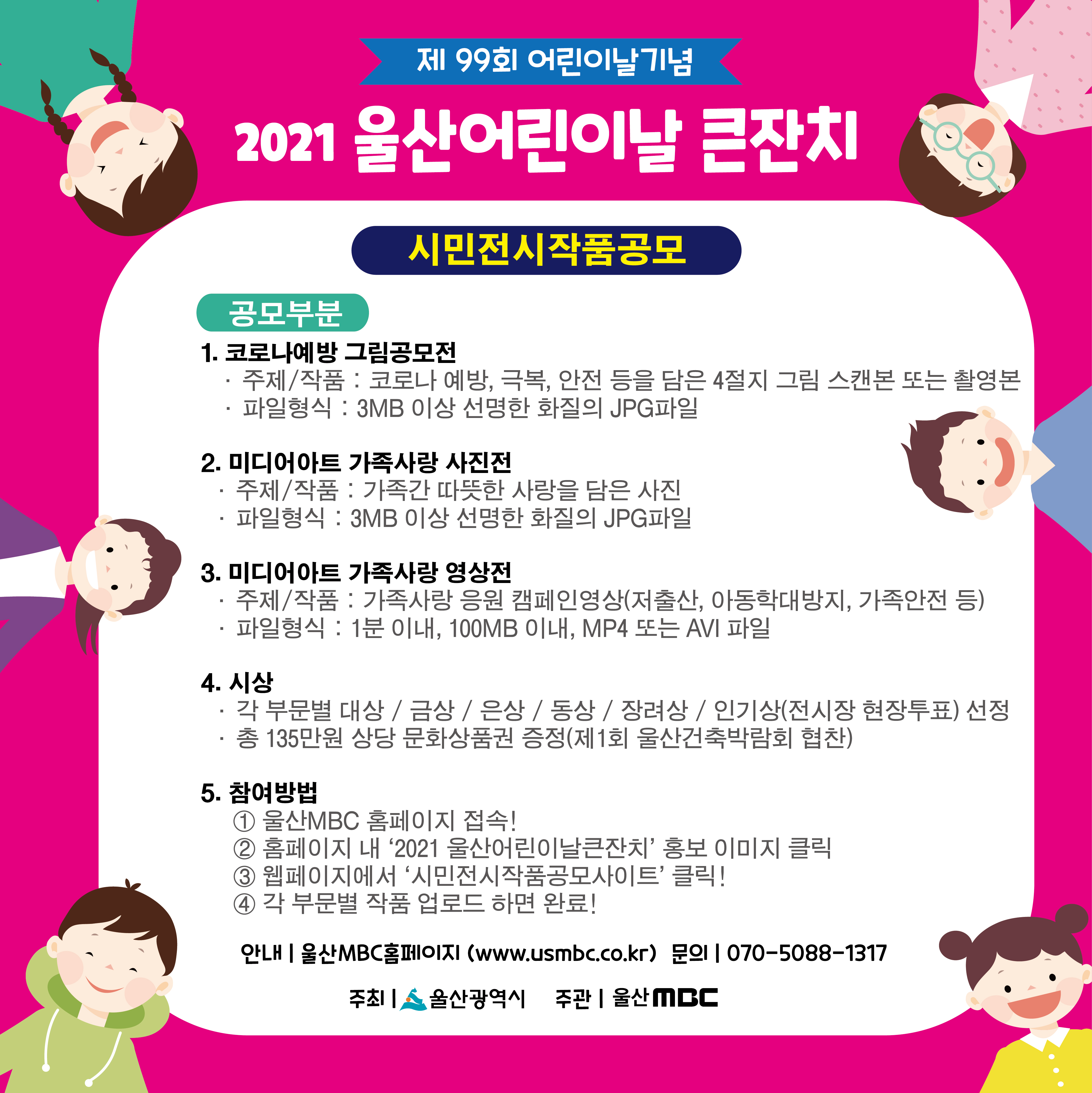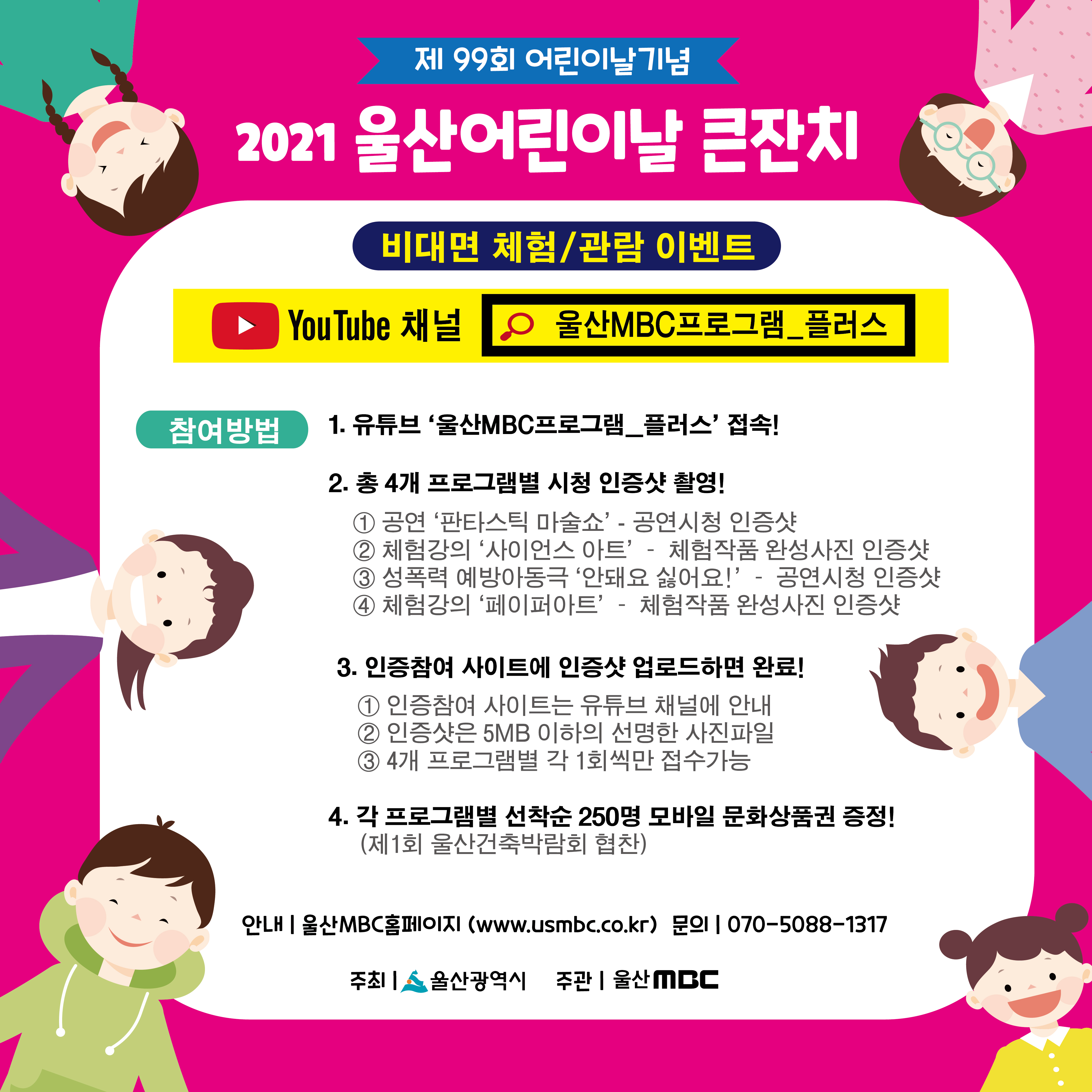 울산MBC 문화행사 2021 울산 어린이날 큰잔치 이벤트 참여 참여문의 070-5088-1317 목록으로 판타스틱 마술쇼! 관람 바로가기 사이언스아트 관람 바로가기 성폭력예방 아동극 관람 바로가기 페이퍼아트 관람 바로가기시청인증참여사이트 바로가기시민전시작품 공모 사이트 바로가기