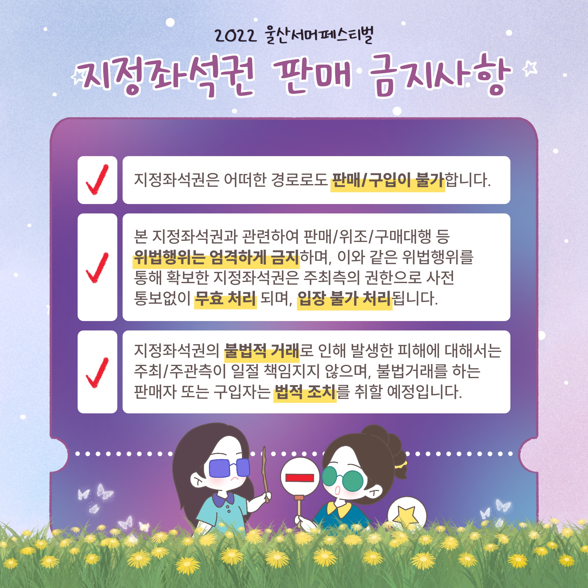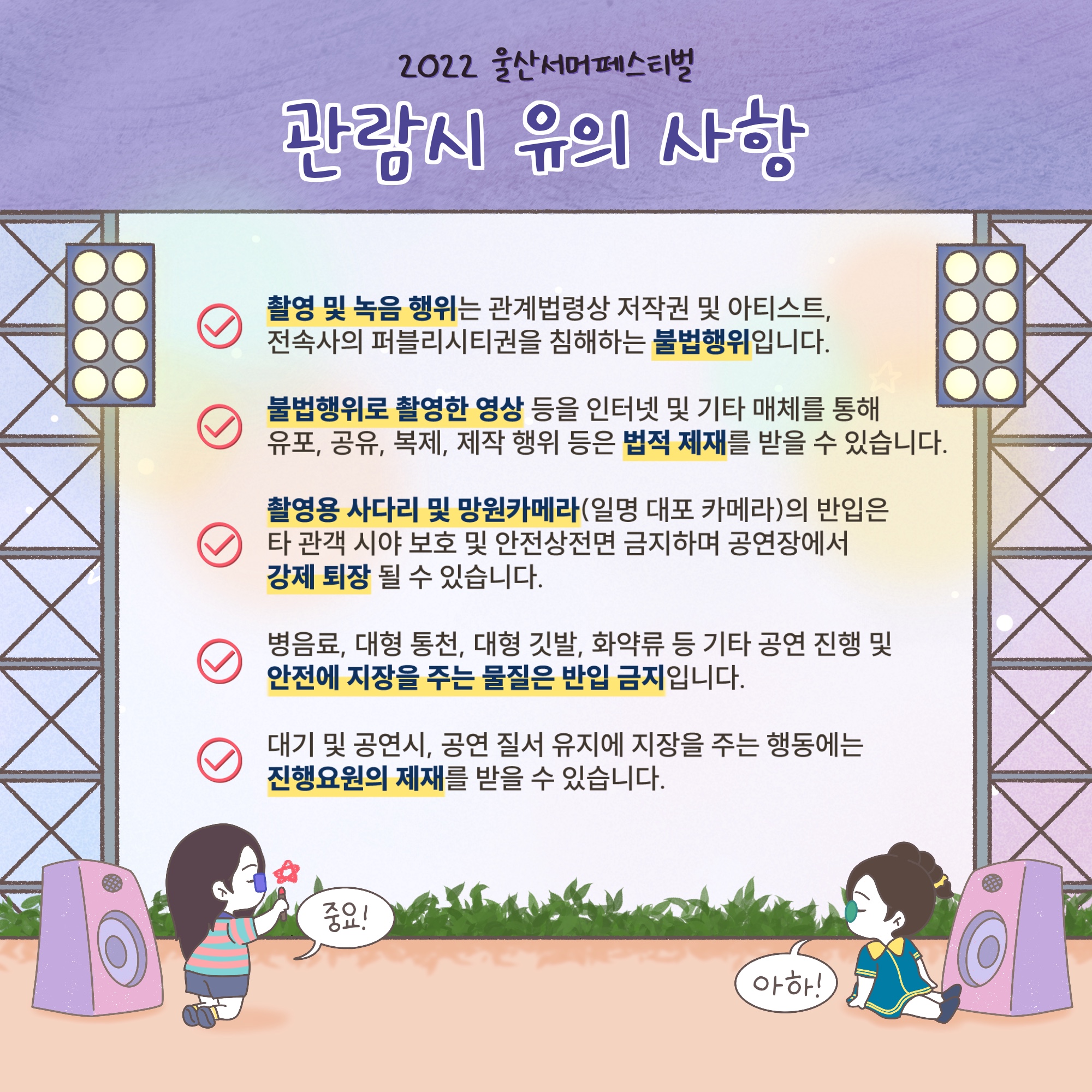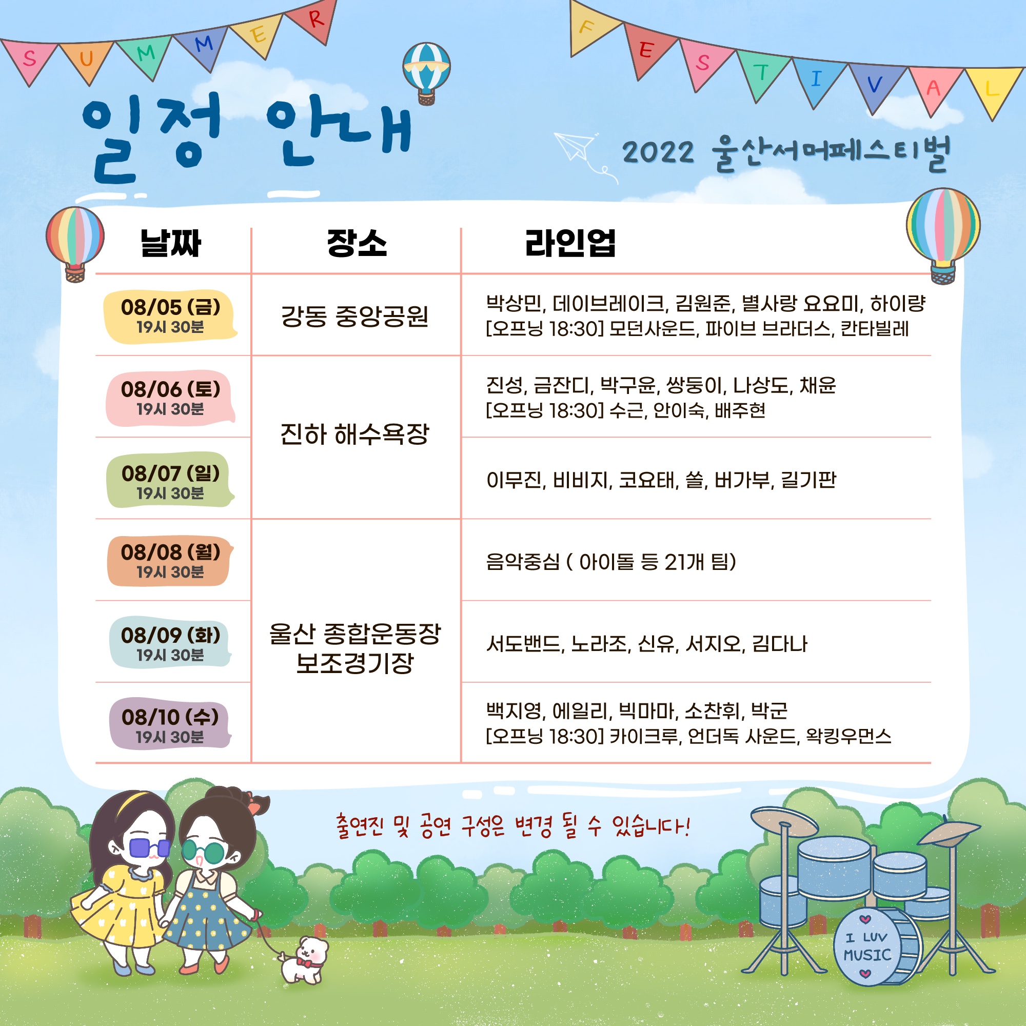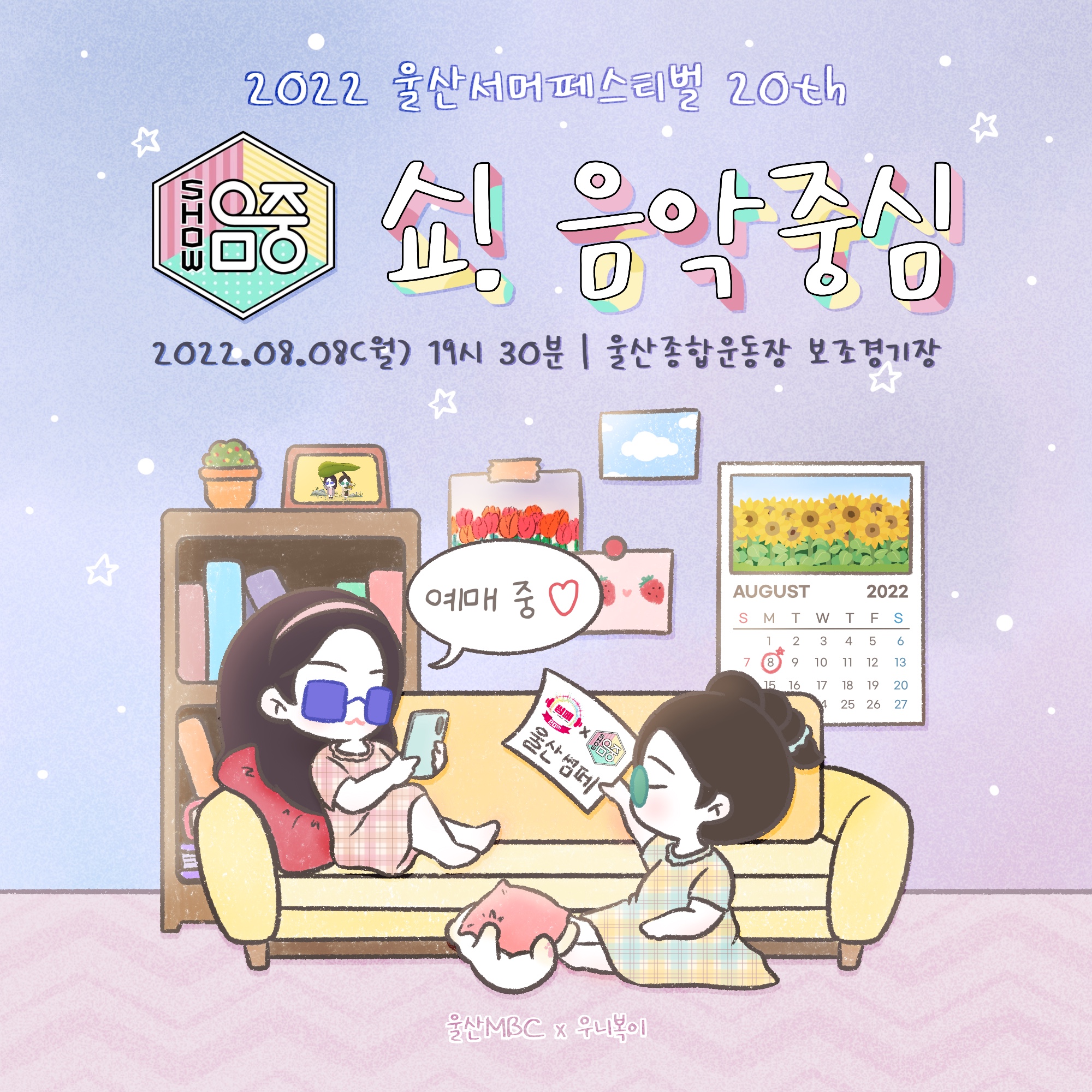 - "울산 서머페스티벌"의 모든 공연은 선착순 무료관람입니다. (단, 8월 8일 쇼!음악중심 공연은 인터넷 지정좌석 예매)