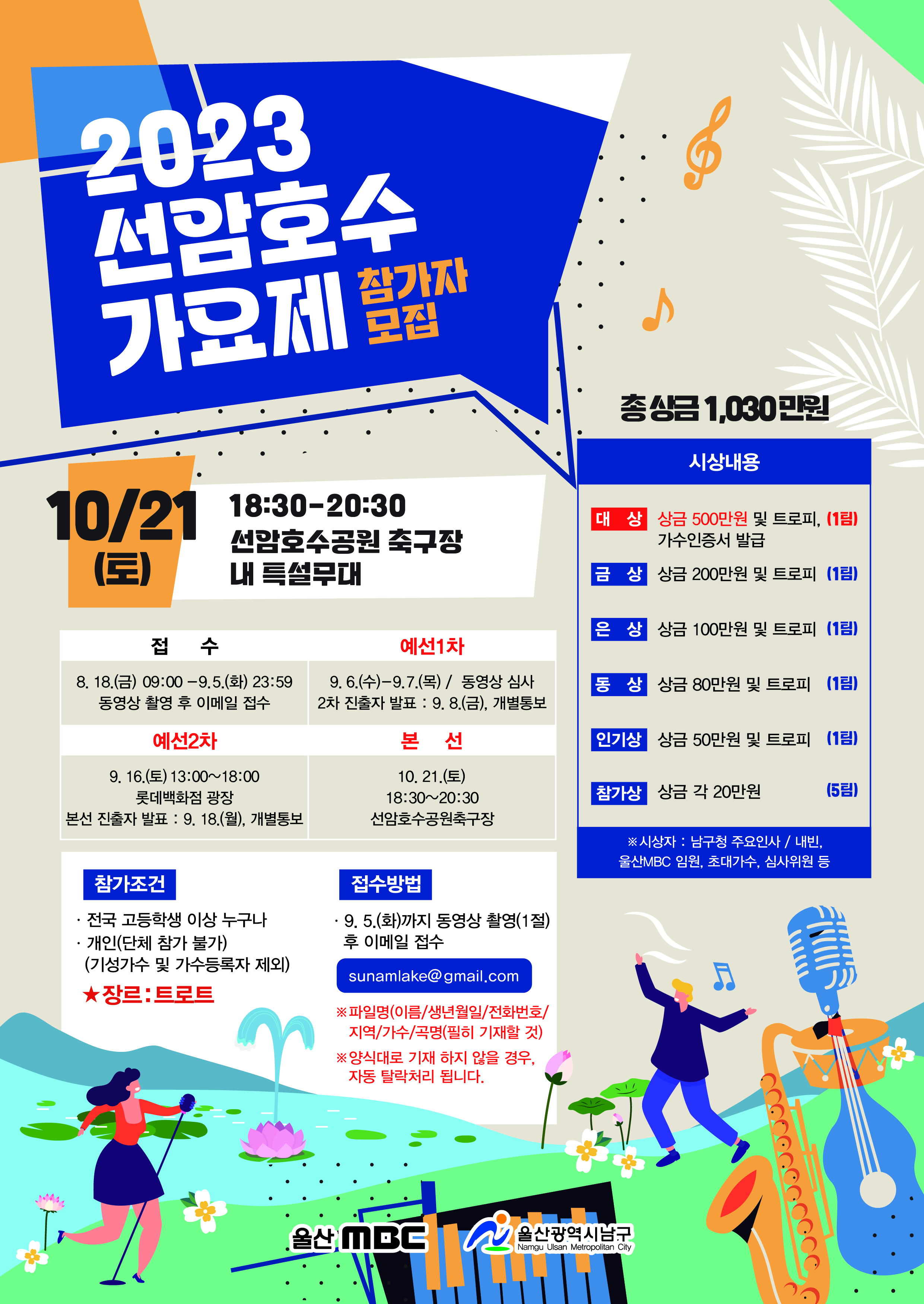 - 9월 5일(화)까지 동영상 촬영 후 이메일 접수 - sunamlake@gmail.com