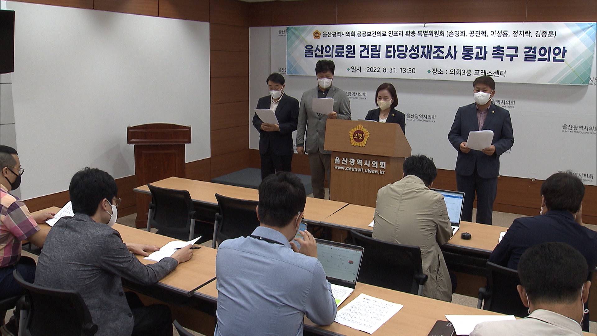 울산시의회 공공의료인프라 확충 특별위원회는 오늘(8/31) 울산의료원 건립 타당성 재조사 통과를 위한 촉구 결의안을 국회와 정부 등에 제출한다고 밝혔습니다. 손명희 위원장을 비롯한 시의원 4명으로 구성된 특위는 울산의 열악한 의료 현실을 감안하면 공공의료원 건립 타당성과 경제성이 충분하다고 주장했습니다. 울...