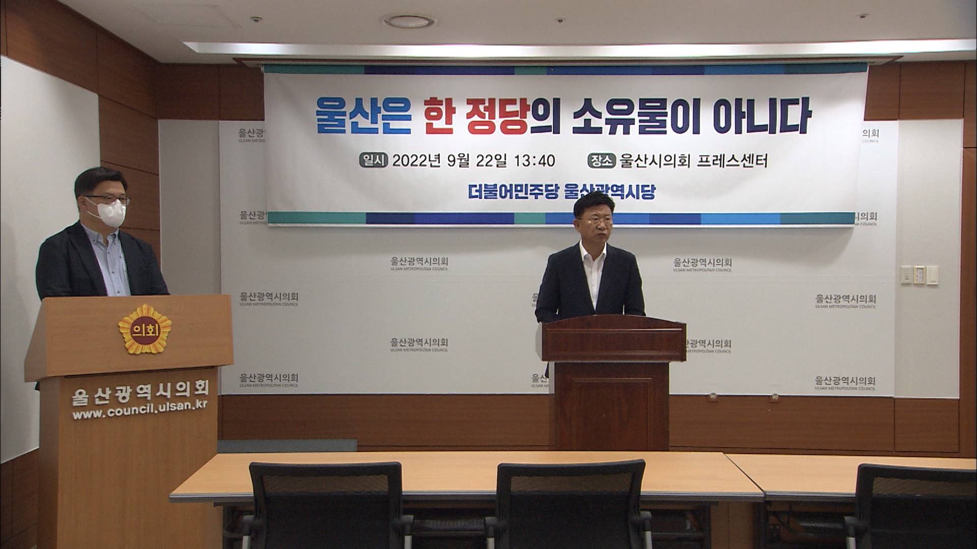 이선호 더불어민주당 울산시당위원장은 오늘(9/22) 기자회견을 열고 여야 경제공동협의체 구성을 제안했습니다. 이 위원장은 부울경 메가시티와 부유식해상풍력 사업 등 민선 7기에 추진됐던 주요 사업들이 아무런 의견 수렴 없이 퇴행 수순을 밟고 있다며 지속가능한 지역 경제 발전을 위해 여야가 힘을 모아야 한다고 주...