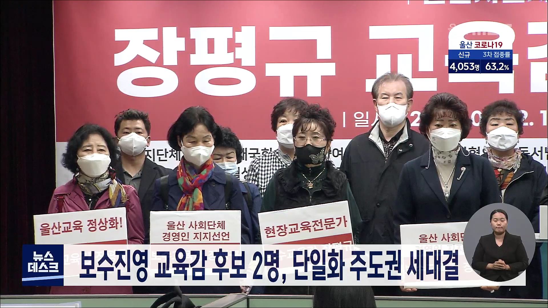 보수진영 교육감 후보 2명이 단일화 논의에 앞서 주도권을 잡기 위한 세 대결에 나섰습니다. 산수원애국회 등 25개 단체와 기업은 학생들이 올바른 인성과 가치관으로 학업에 전념할 수 있게 이끌 사람은 장평규 교육감 예비후보 뿐이라며 지지를 선언했습니다. 오늘(4/12) 예비후보로 공식 등록한 김주홍 울산대 교수는 모...