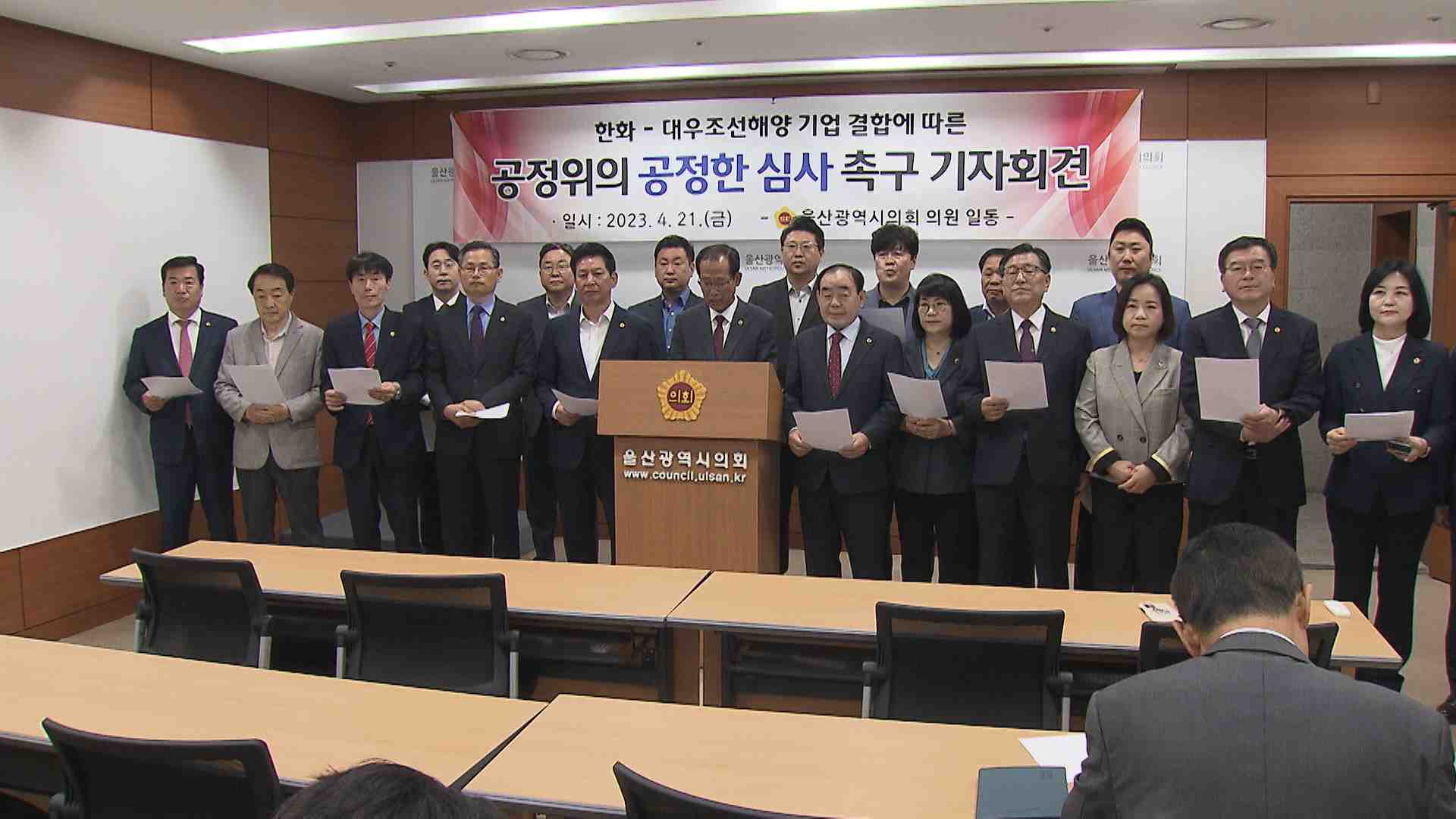 공정거래위원회의 한화그룹대우조선해양 기업결합 심사 승인을 앞두고 울산시의회 의원들이 공정한 심사를 촉구하고 나섰습니다. 울산시의회 의원 22명은 오늘(4/21) 오전 기자회견을 열고 기업결합 필요성은 공감하지만 방산분야의 독점적 지위를 가진 한화그룹과 대우조선해양 간 수직계열화로 수상함정, 잠수함 등 특수...