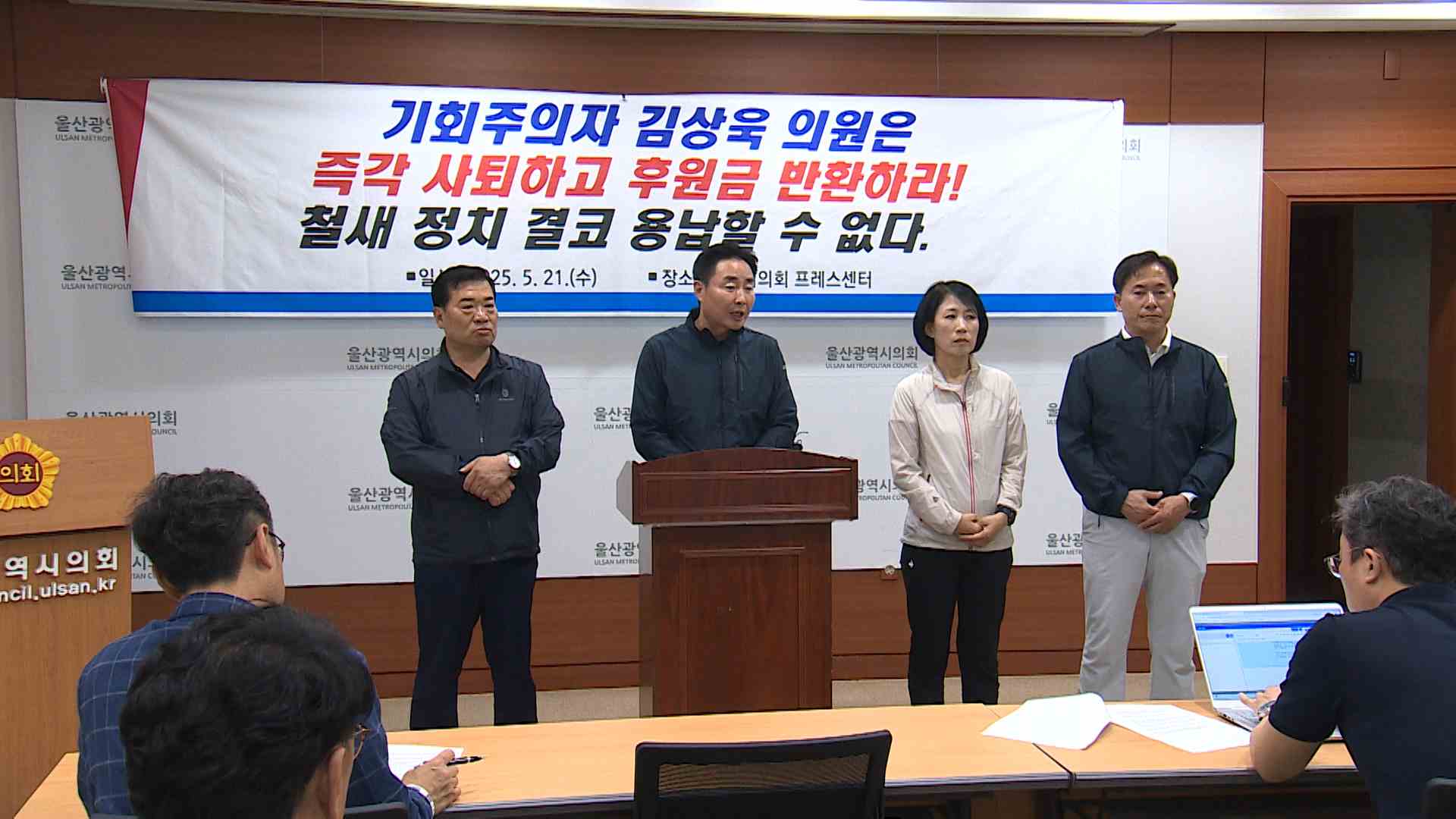 국민의힘 남구갑 시·구의원들은 오늘(5/21) 기자회견을 열고 민주당으로 당적을 옮긴 김상욱 의원에게 정치후원금을 반환을 요구했습니다. 이들은 국민의힘 소속으로 정치후원금을 모으고 민주당으로 당을 옮긴 것은 기만이라며, 후원자들과 함께 후원금 반환 운동에 나서겠다고 밝혔습니다. 또 김상욱 의원이 탈당과 민주...