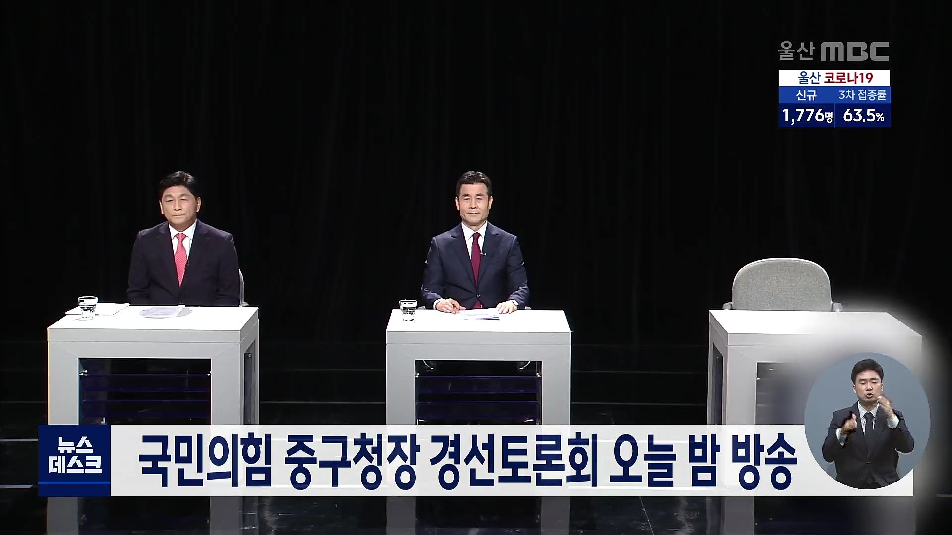 울산MBC가 주최한 국민의힘 중구청장 후보 경선토론회가 오늘(4/26) 밤 11시 30분부터 70분 동안 방송됩니다. 문병원, 김영길 후보는 인구 감소로 위기에 처한 중구의 지역 경제를 살릴 방안에 대해 열띤 토론을 펼쳤으며, 고호근 후보는 당내 경선 과정의 문제를 제기하며 참석하지 않았습니다.//