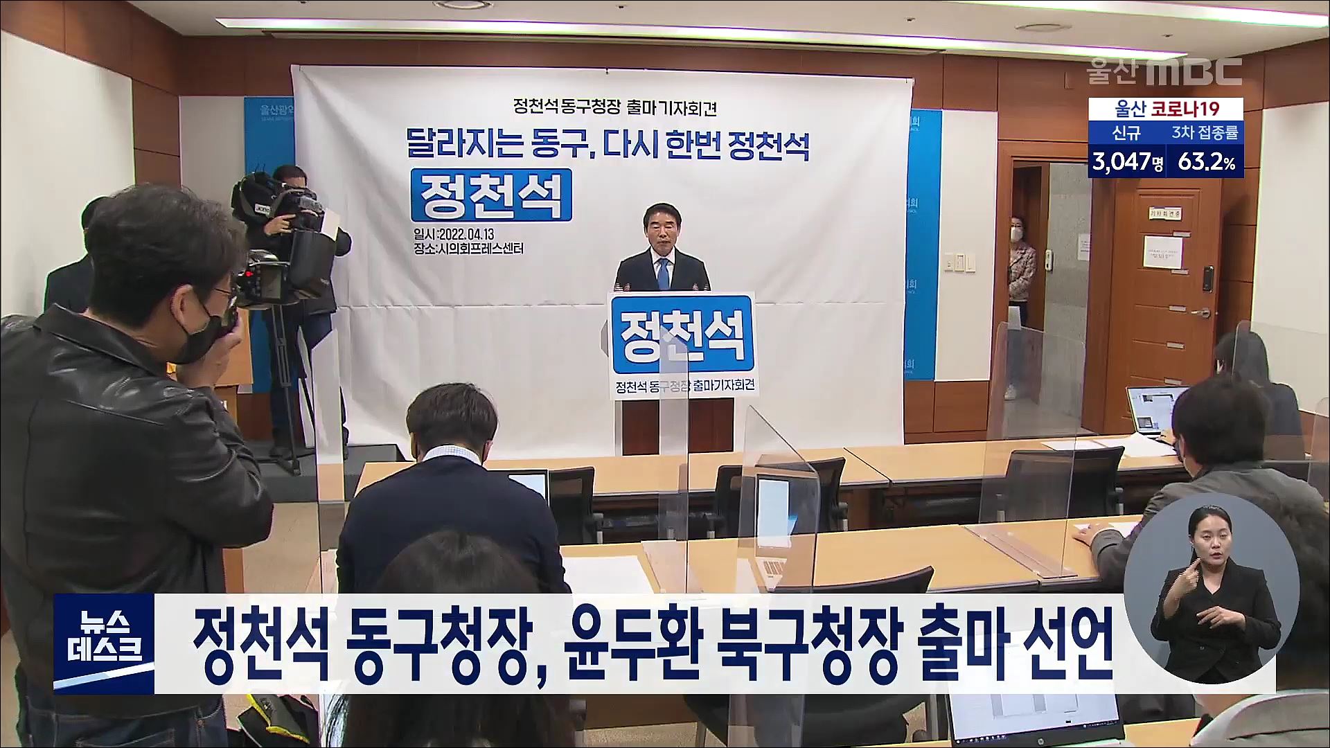정천석 동구청장이 오늘(4/13) 기자회견을 열고 더불어민주당 소속으로 재선에 도전한다고 밝혔습니다. 정 구청장은 대왕암공원과 슬도에 체류형 관광지를 조성해 해양도시 동구의 가치를 한 단계 더 끌어올리겠다고 약속했습니다. 한편, 윤두환 전 국회의원은 국민의힘 소속으로 북구청장 출마를 선언하고 보수 험지로 불...