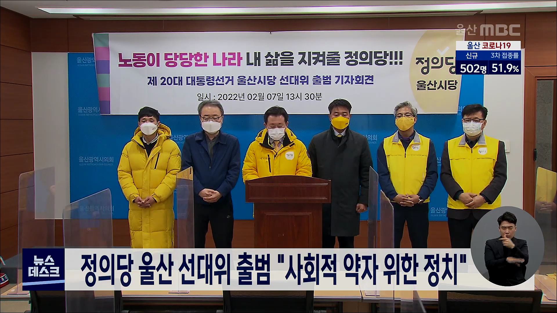 정의당은 오늘(2/7) 울산시의회에서, 심상정 대선 후보 울산선거대책위원회 출범식을 열고 불평등한 정치를 끝내야 한다고 주장했습니다. 김진영 상임 선대위원장은 거대 양당 후보 측근에 대한 의혹과 사과가 난무하는 대선 레이스 속에서 사회적 약자를 위한 정책을 실천할 수 있는 정당은 정의당뿐이라고 강조했습니다.