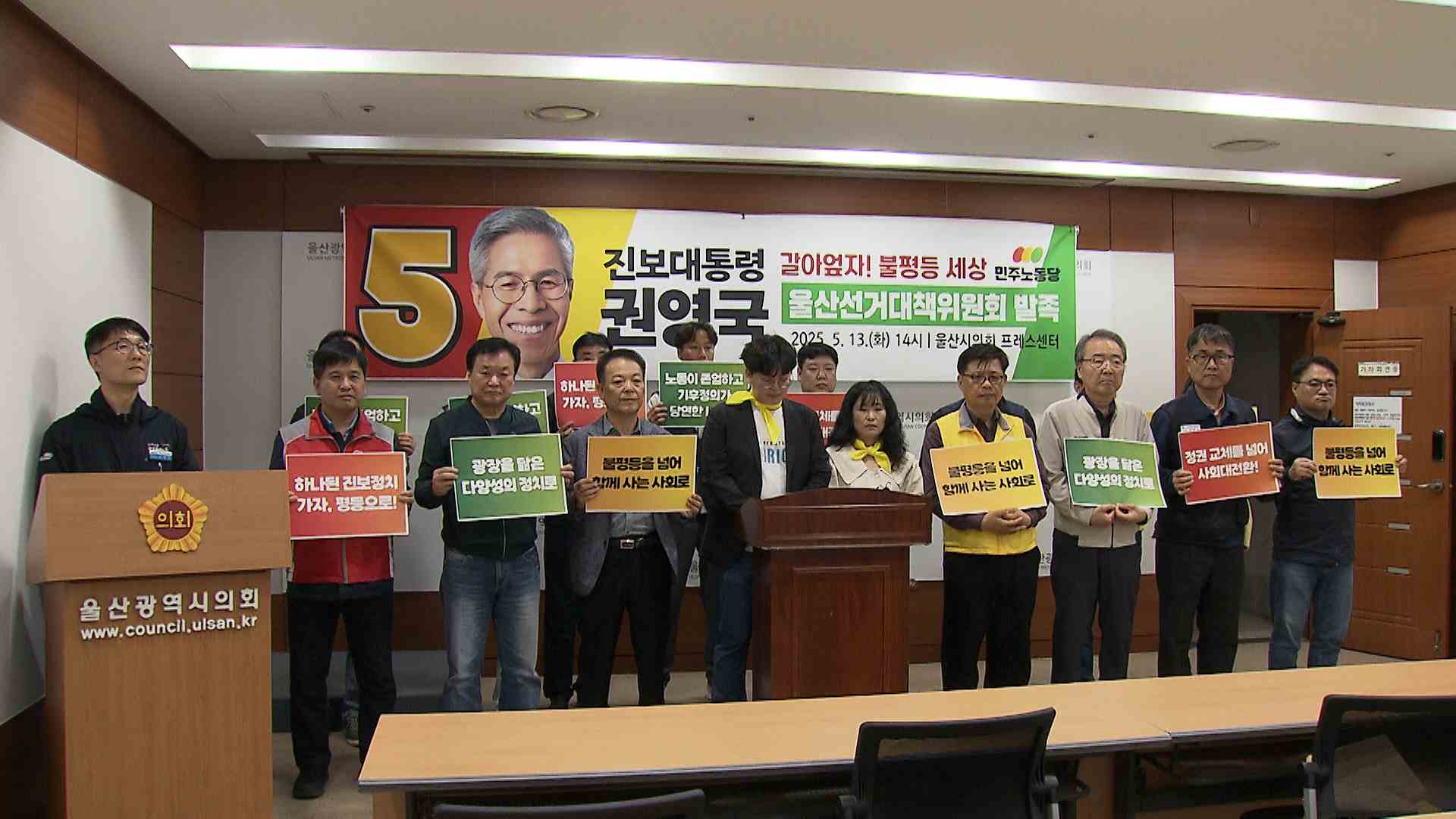 민주노동당은 오늘(5/13) 울산 선거대책위원회 발족 기자회견을 열고 기호 5번 권영국 후보 지지를 호소했습니다. 선대위는 이번 대선을 통해 내란 세력을 청산하고 거대 정당의 기득권 체제를 근본적으로 변화시켜야 한다며 사회적 약자의 목소리를 대변하는 유일한 후보가 권 후보라고 주장했습니다. 울산지역 공약으로는...