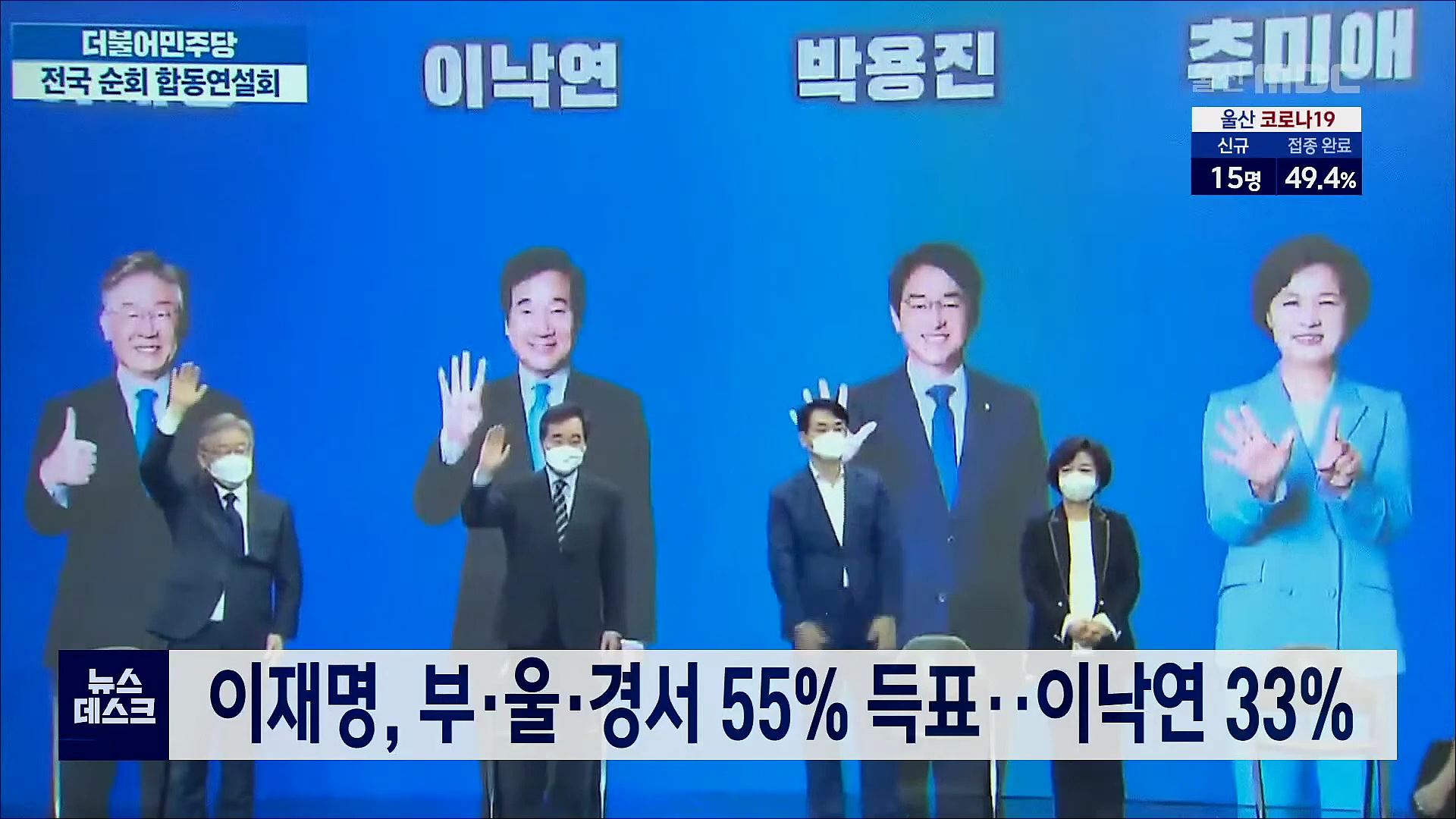 더불어민주당 대선후보 부산·울산·경남 지역 순회경선에서 이재명 경기지사가 과반 득표로 압승 행진을 이어갔습니다 이 지사는 오늘(10/2) 오후 부산항국제전시컨벤션센터에서 열린 부울경 경선에서 득표율 55.34%로 1위에 올랐습니다. 이낙연 전 대표는 33.62%로 2위를, 추미애 전 법무부 장관 9.74%, 박용진 의원 1.30% ...