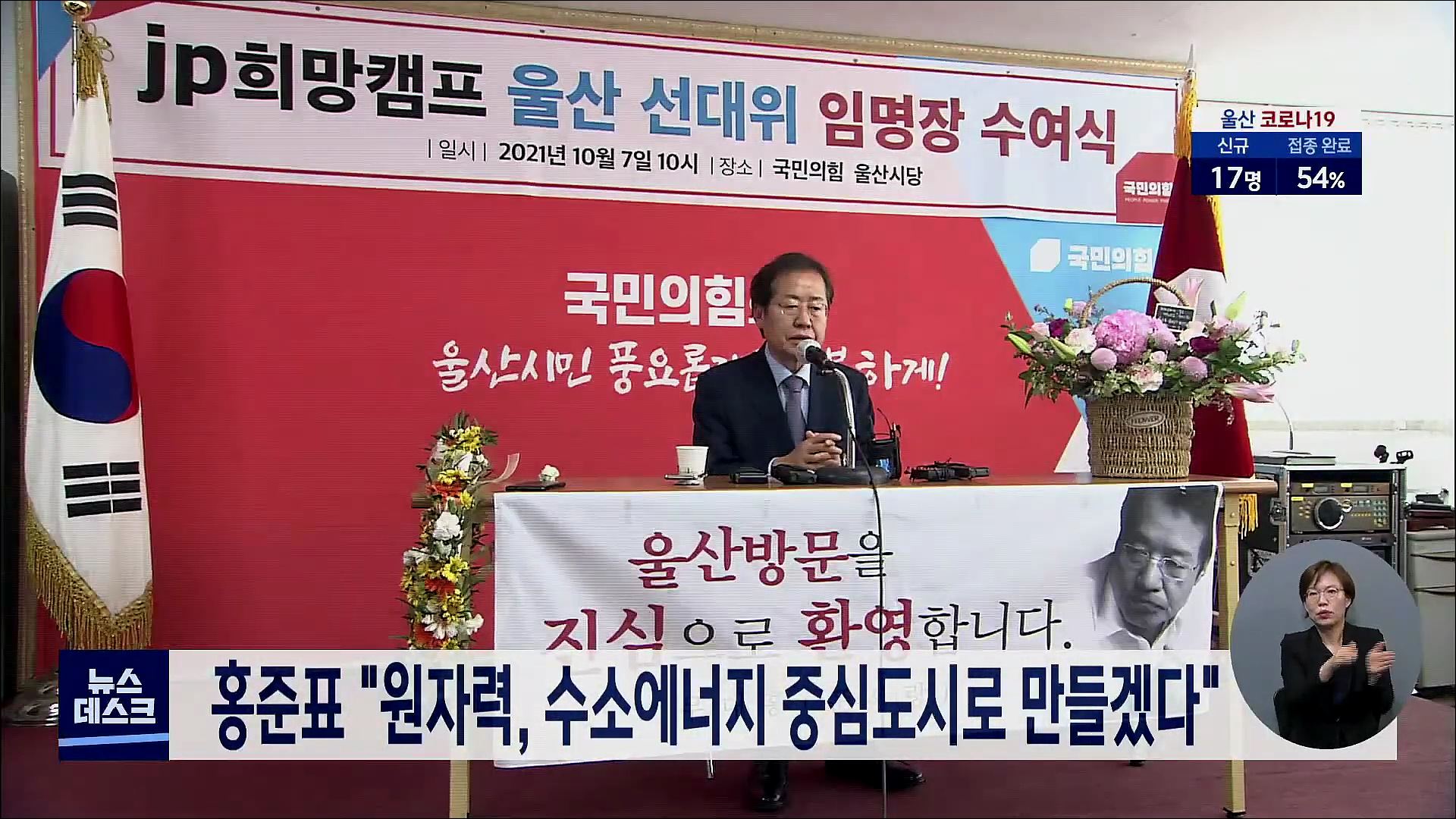 홍준표 국민의힘 대선 경선 후보는 오늘(10/7) 울산을 방문해 울산은 수소 에너지 중심 도시로 만드는데 전폭적인 지원을 약속했습니다. 홍 후보는 jp희망캠프 울산선대위 발대식에 참석해 원자력과 수소에너지를 중심으로 울산이 청정 울산으로 갈 수 있도록 준비를 하겠다고 밝혔습니다. 또 울산과 우리나라 경제 위기 극...
