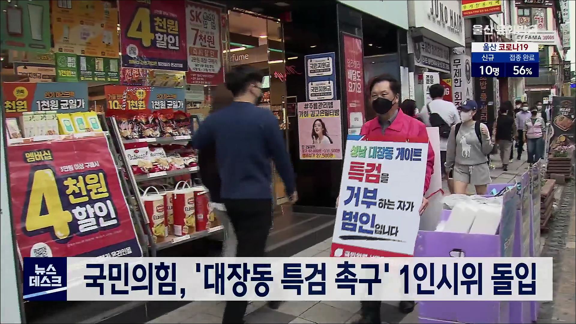 국민의힘 울산시당이 대장동 개발사업 특혜 의혹 규명을 위한 특검 설치를 요구하며 울산 전 지역 1인 시위에 돌입했습니다. 국민의힘 당원, 당직자들은 오늘(10/9) 오후 유동 인구가 많은 길거리에서 1인 시위를 시작했으며, 1인 시위는 특검이 수용될 때까지 이어질 것이라고 밝혔습니다.