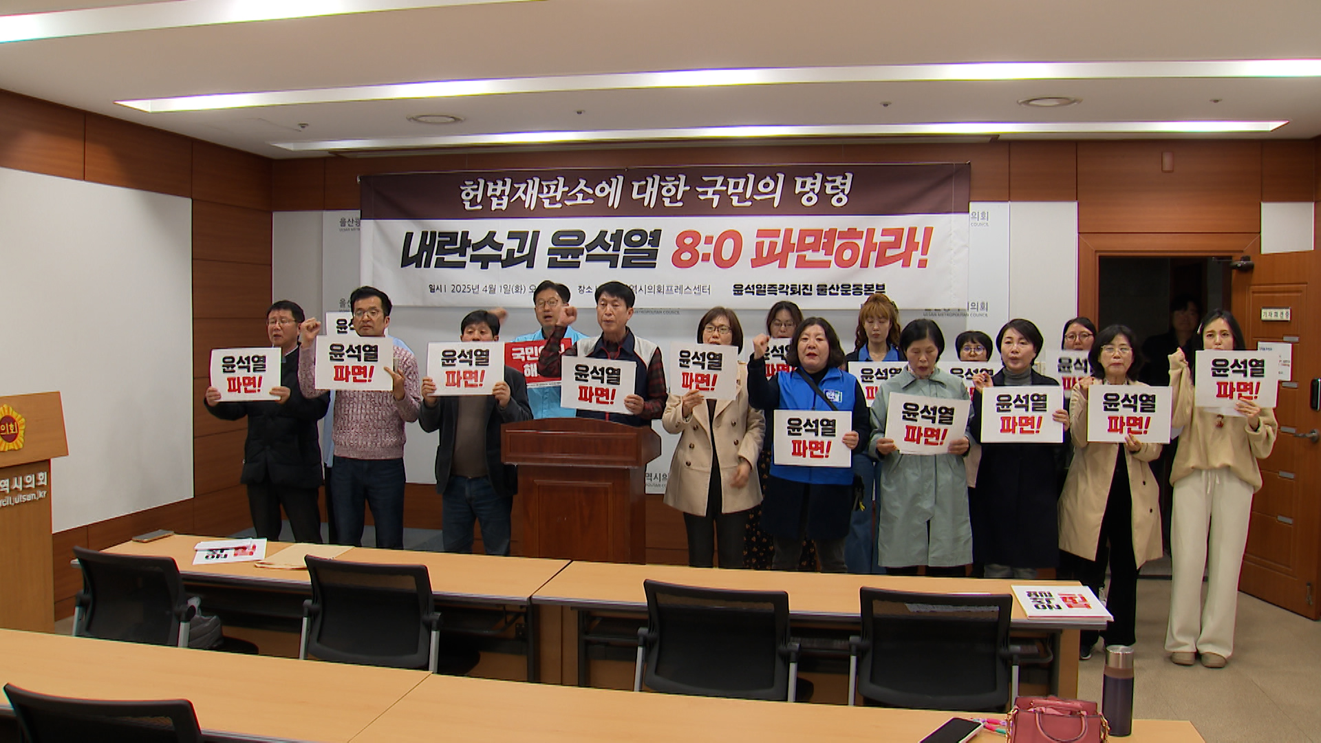 윤석열즉각퇴진 울산운동본부는 오늘(4/1) 기자회견을 열고 윤석열 대통령 탄핵 선고기일이 잡힌 것에 환영한다고 밝혔습니다. 운동본부는 선고기일 확정으로 세간의 우려를 덜게 됐다며, 불법 계엄령을 내린 내란 세력에 대한 헌법재판소의 탄핵 결정을 촉구했습니다. 그러면서 윤석열 대통령은 불법 계엄을 한 그 시각부...