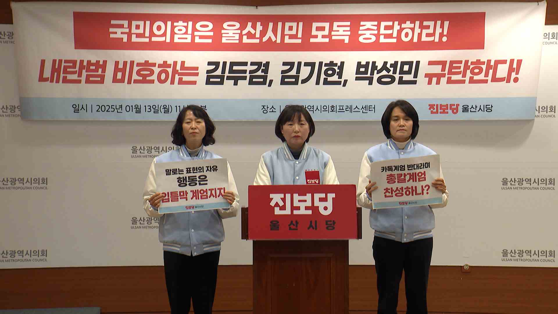 진보당 울산시당은 오늘(1/13) 기자회견을 열고 내란 세력을 비호하는 김두겸 시장과 김기현, 박성민 국회의원을 규탄한다고 밝혔습니다. 이들은 비상계엄 선포 이후 정치, 경제 불안이 가중되는 상황에서 국민의힘 소속 선출직들은 헌정질서를 유린한 내란 행위를 옹호하는데만 몰두하고 있다고 주장했습니다.