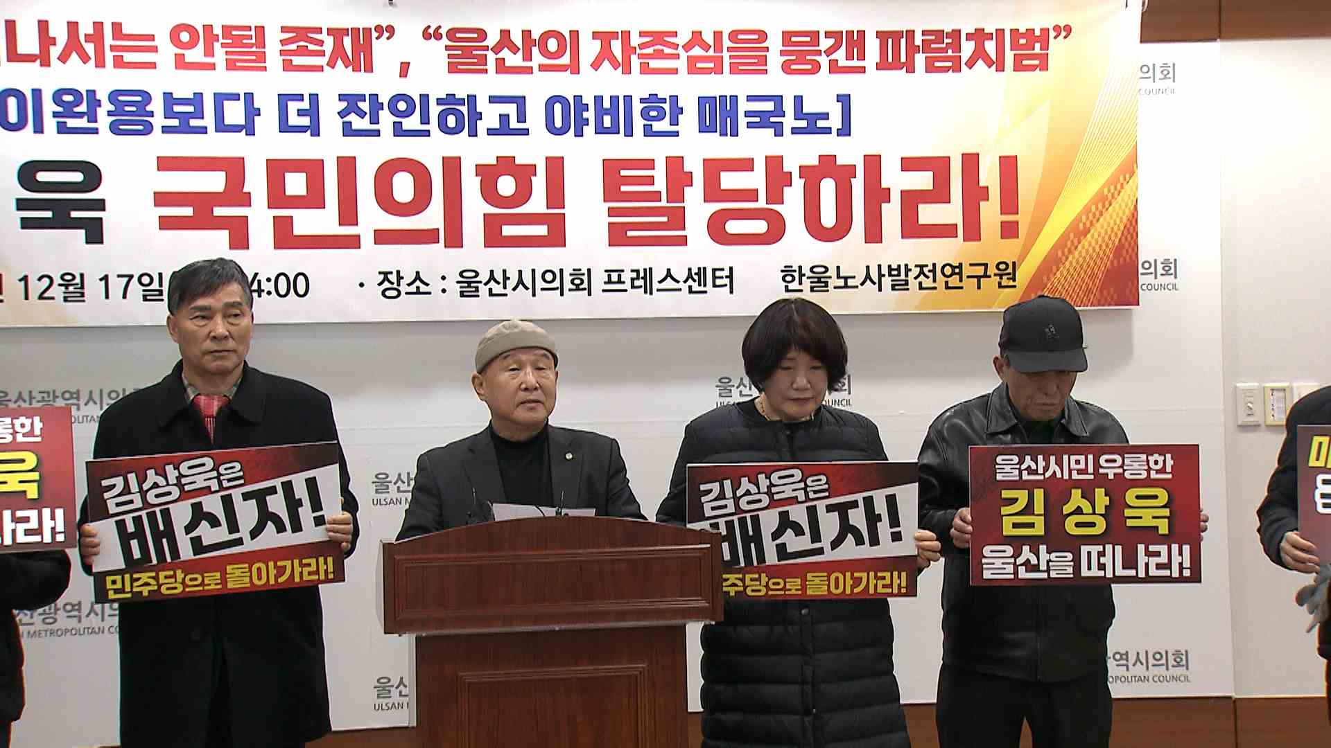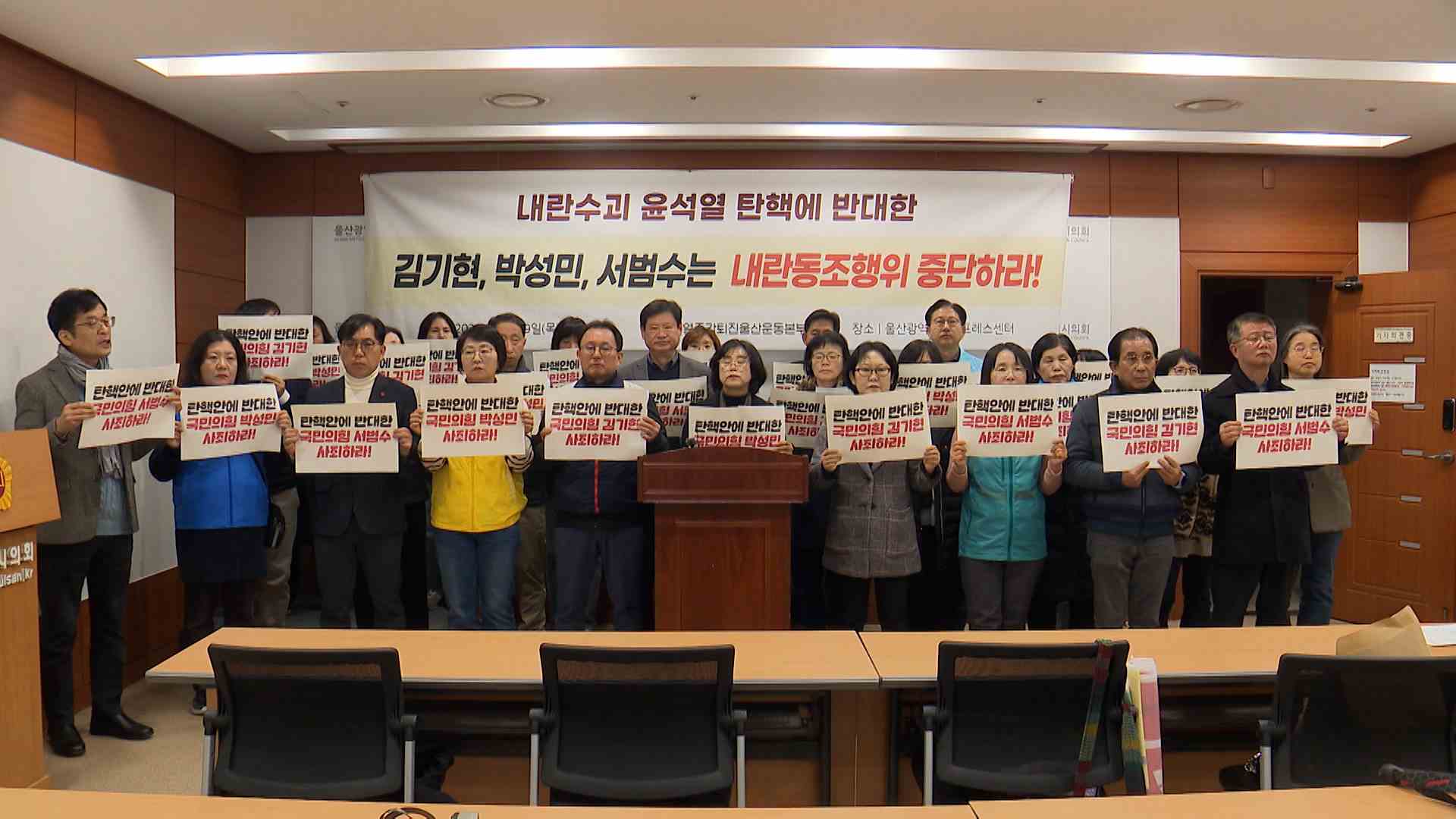 울산지역 시민,노동단체들로 구성된 윤석열퇴진 울산운동본부는 오늘(12/19) 기자회견을 갖고 대통령 탄핵에 반대한 국민의힘 국회의원들을 향해 책임 있는 행동을 요구했습니다.이들은 김기현,박성민,서범수 의원에게 당의 중진 국회의원으로서 극단으로 치닫는 국민의힘의 파행을 중단시키는 역할과 함께 윤석열 파면에도...