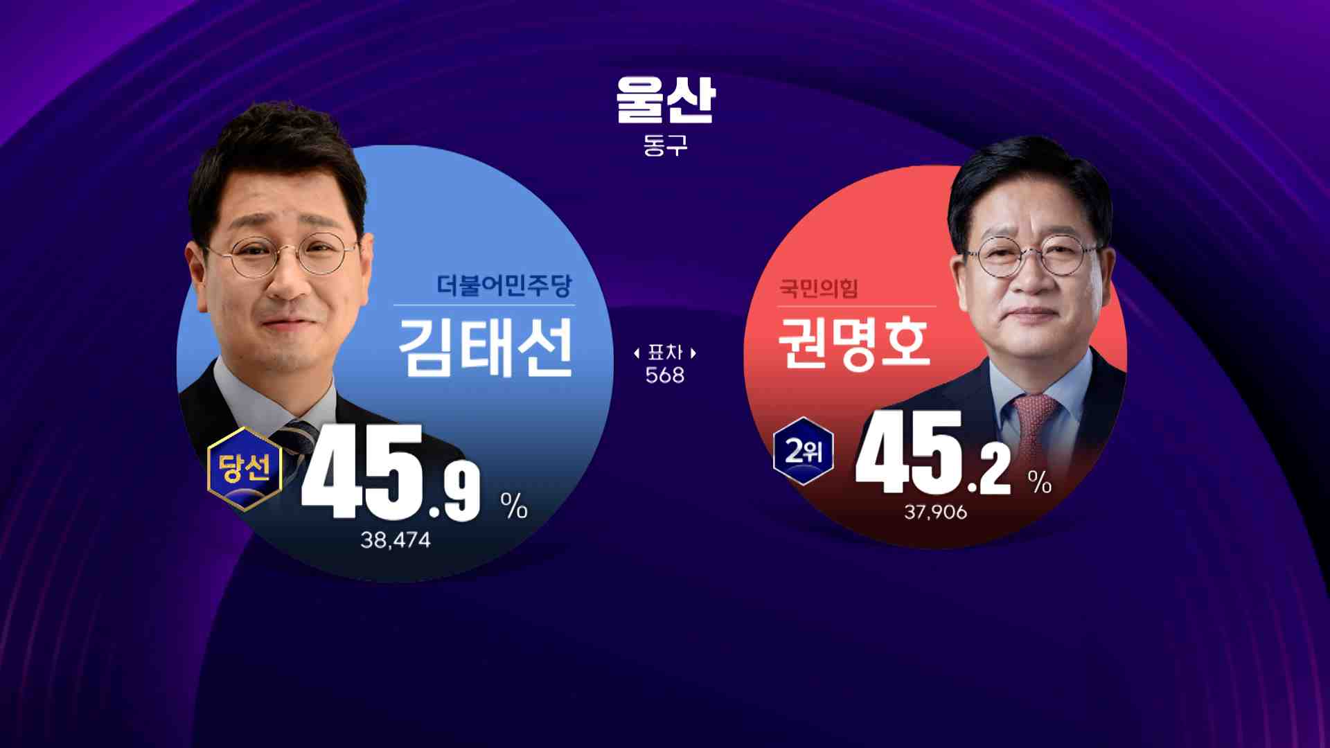 이번 총선에서 울산 동구는 전국에서 두번째로 치열한 선거구로 집계됐습니다. 민주당 김태선 후보와 국민의힘 권명호 후보의 표 차이는 568표로, 497표 차이로 승부가 난 경남 창원진해에 이은 두번째 박빙 선거구로 기록됐습니다. 김태선 당선인은 동구 방어동과 일산동에서 열세를 보였지만, 남목동과 전하동, 사전투표 ...