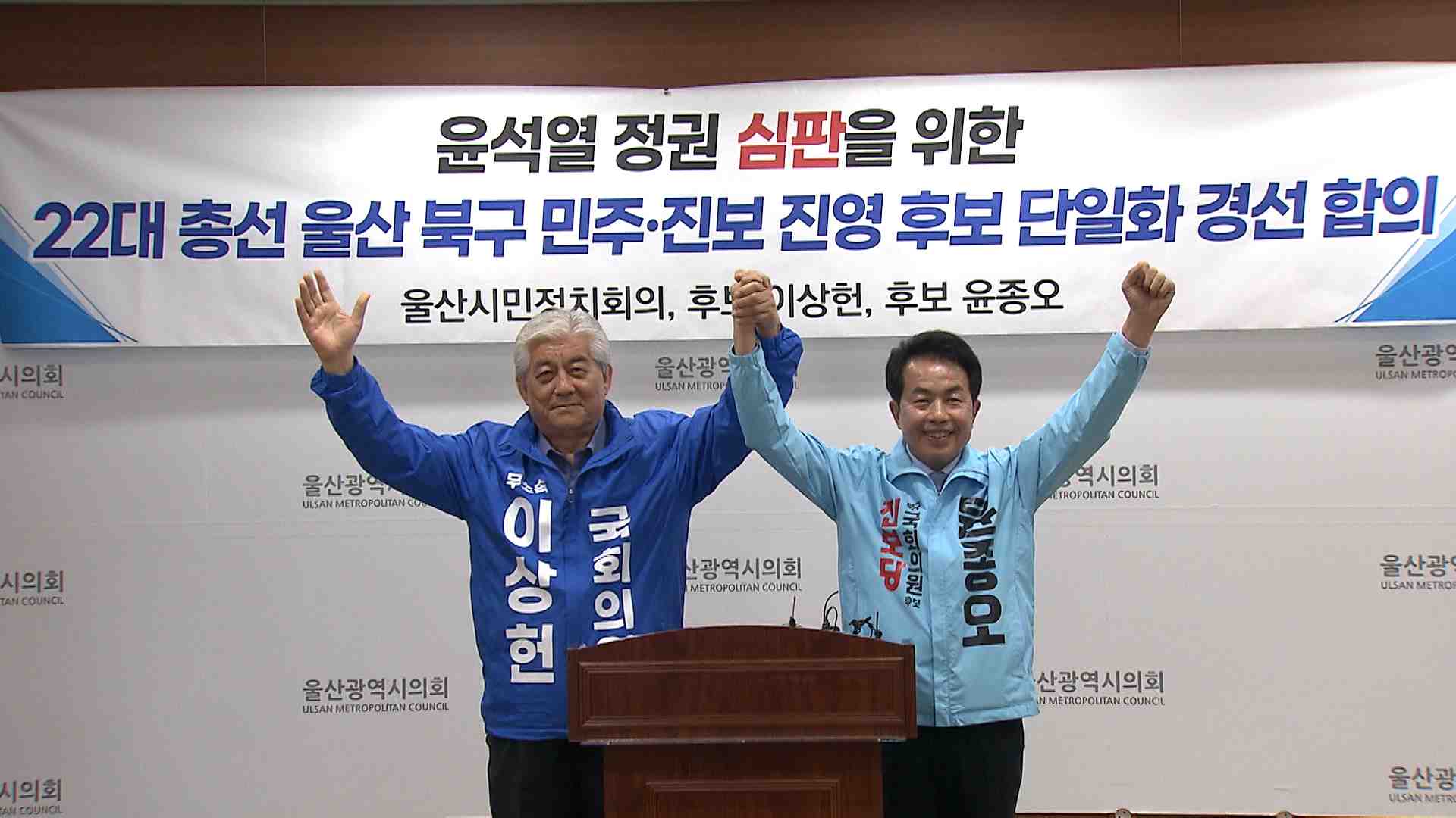 북구에 출마한 진보당 윤종오 후보와 무소속 이상헌 후보가 단일화 경선 방식에 합의했다고 밝혔습니다. 두 후보는 북구 주민을 대상으로 오는 23일과 24일 이틀 동안 여론 조사를 실시해 24일 오후에 결과를 발표할 예정입니다. 한편 동구에 출마한 더불어민주당 김태선 후보도 기자회견을 열고 노동당 이장우 후보에게 경...