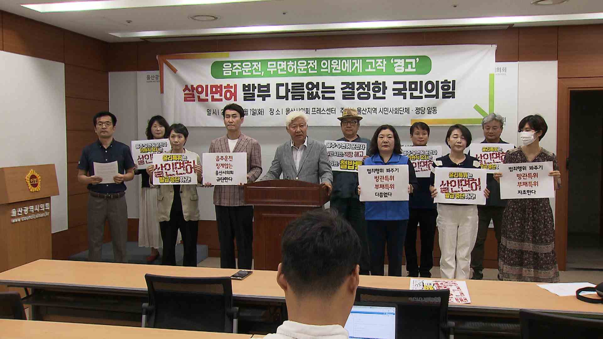 울산시민연대는 오늘(7/1) 기자회견을 열고 무면허 운전을 한 홍성우 의원에 대해 울산시의회 윤리특위가 가장 낮은 수위의 징계인 경고를 의결한 결정을 납득할 수 없다고 밝혔습니다. 시민연대는 윤리자문위원회가 경징계인 공개사과를 권고했지만 윤리특위는 이런 권고마저 무시하고 징계를 더 완화했다며, 국민의힘 시...