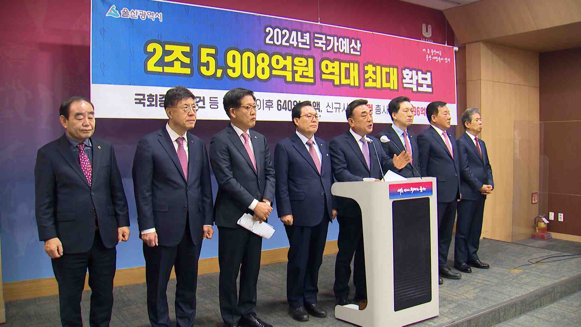 2024년도 국가예산 확보 성과 기자회견이 오늘(1/8) 울산시청 프레스센터에서 열렸습니다.울산시가 정부의 긴축재정 기조에도 올해 역대 최대 규모인 2조5천908억원의 국비를 확보했다고 밝혔습니다. 이 회견에는 국민의힘 소속 김기현·이채익·박성민·권명호 의원이 함께 참석했습니다.