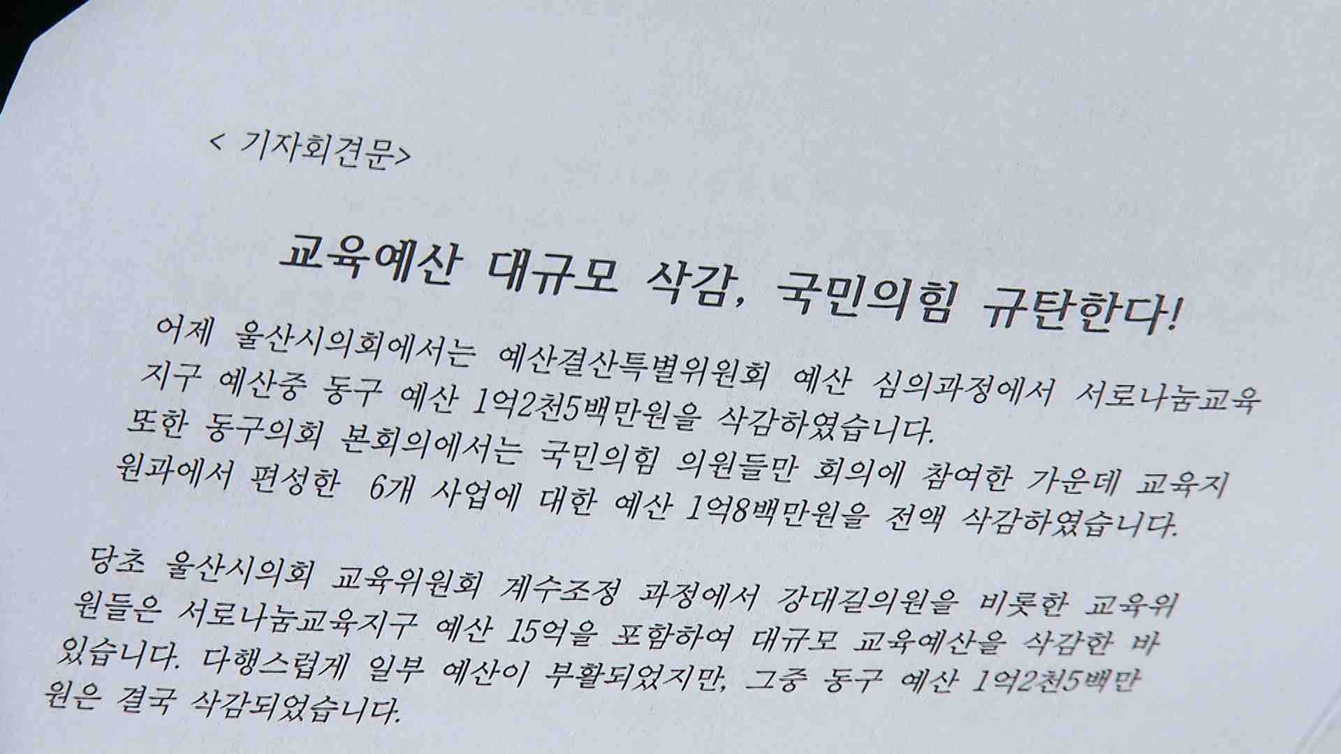 동구의회 본회의에서도 교육 사업 예산 1억 8백만 원이 삭감되면서 갈등이 이어지고 있습니다. 오늘(12/12) 진보당 동구지역위원회는 교육반상회사업 등은 동구 교육 환경 개선에 큰 의미가 있는 사업인데 국민의힘 의원들의 주도로 교육 예산이 대규모 삭감됐다고 비판했습니다. 이에 대해 동구 국민의힘 의원들은 삭감된 ...
