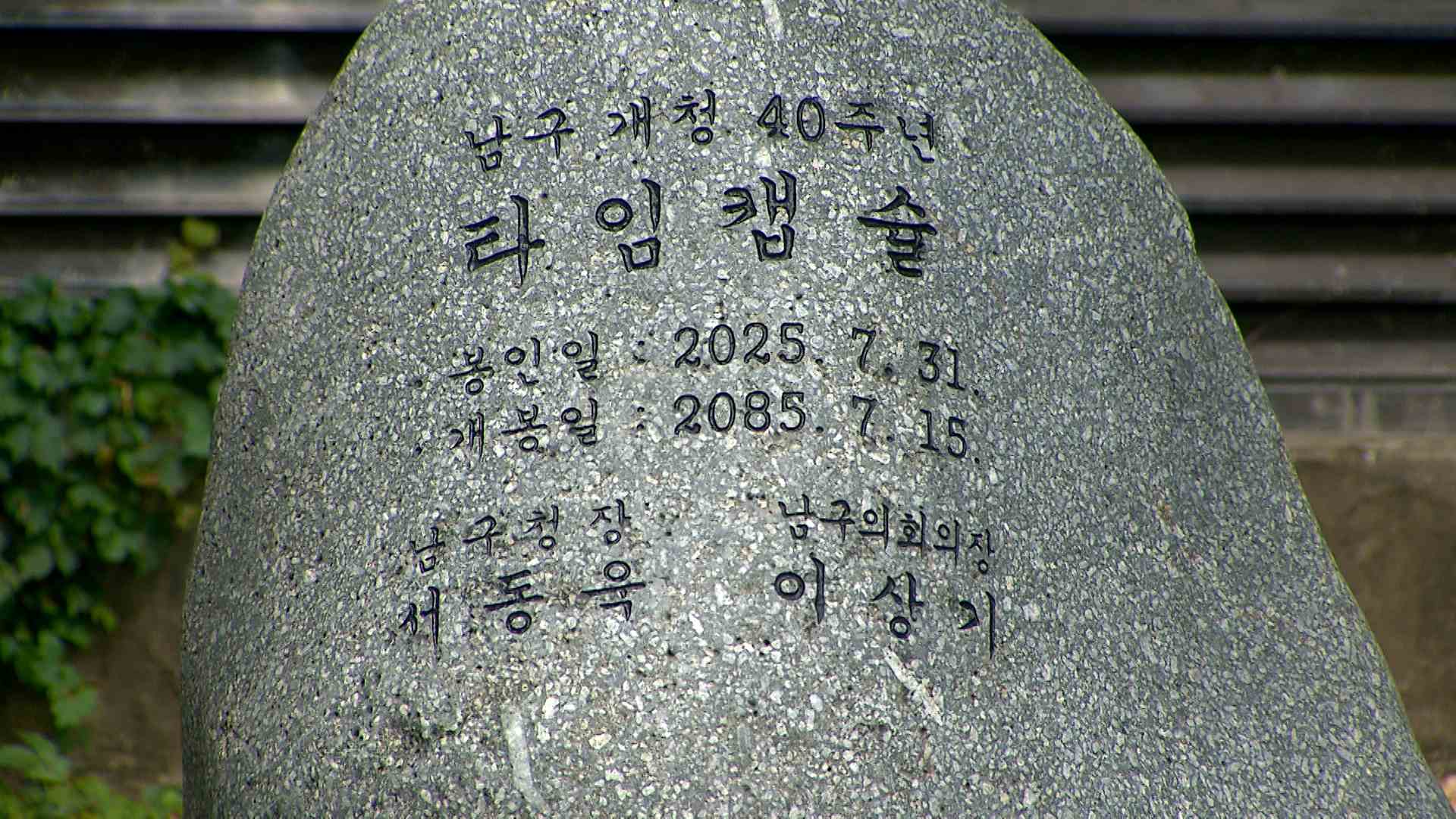 울산 남구가 개청 40주년을 맞아 지역의 지난 40년 역사와 미래상을 담은 타임캡슐을 제작해 청사 정원에 봉인했습니다. 남구의 타임캡슐에는 지속가능발전 추진계획, 울산고래축제와 장생포 수국페스티벌 기념품, 구정 성과집 등 모두 24종의 봉인 물품이 담겼습니다. 남구는 이번에 봉인한 타임캡슐을 오는 2085년 개청 1...