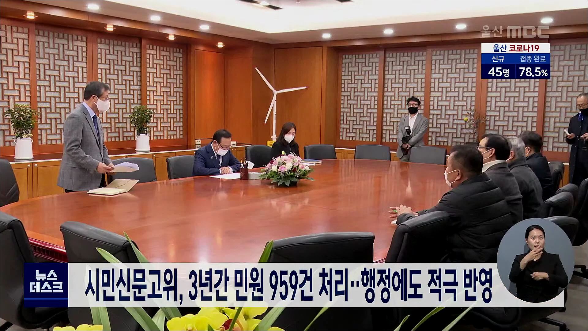 울산시는 민선 7기 출범한 시민신문고위원회가 지난 3년 동안 민원 959건을 접수해 처리하는 성과를 거뒀다고 밝혔습니다. 또 위원회의 조치 요구 중 98.4%를 담당 행정 부서가 수용하는 등 위원회 활동에 대한 지자체 행정 반영률도 높았습니다. 시민신문고위원회는 시민들의 각종 민원을 관련 전문가와 중립적인 위원들이...