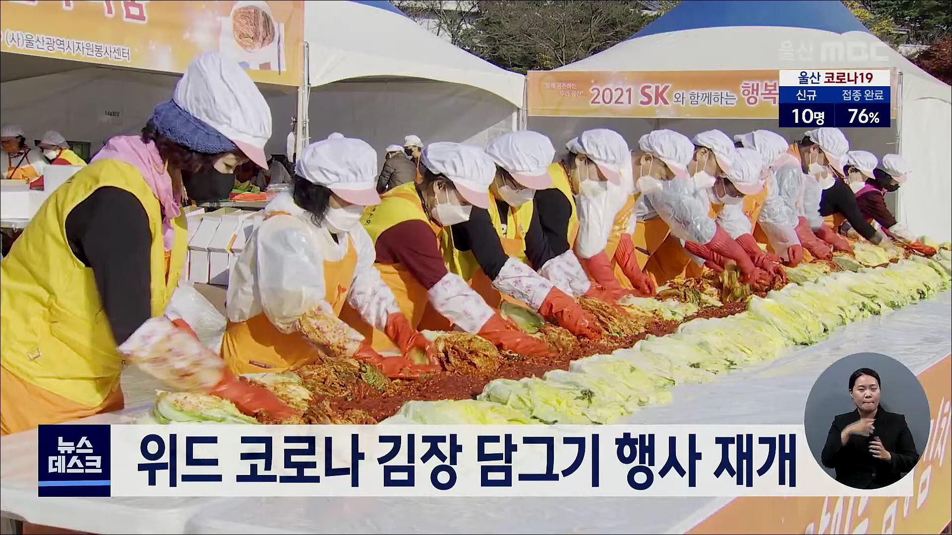 단계적 일상 회복에 맞춰 그동안 자제했던 김장 담그기 행사가 재개됐습니다. SK이노베이션와 울산시자원봉사센터는 오늘(11/17) 저소득층과 사회복지시설에 전달할 김장김치 1만 2천 포기를 담궜습니다. 지난해에는 코로나19 확산을 막기 위해 10kg 김장완제품을 구입해서 전달했습니다. ◀INT▶ 김명옥 / SK에너지 홍보...