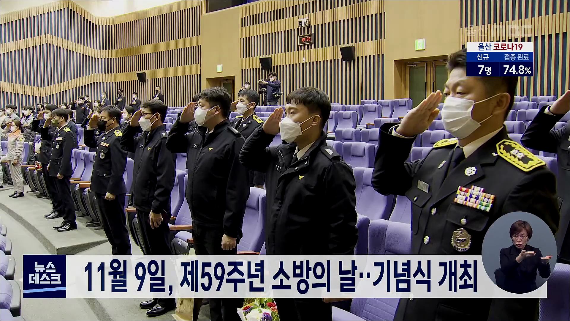 11월 9일인 제 59주년 소방의 날을 맞아 울산에서도 기념식이 개최됐습니다. 오늘 기념식에서는 시민 안전에 기여한 공로로 박중규 동부소방서장이 근정포장을, 남부소방서 박동제 소방경이 국무총리 표창을 받았습니다. 또 소방 행정 발전에 기여한 소방공무원과 시민 등 117명도 표창을 받았습니다.