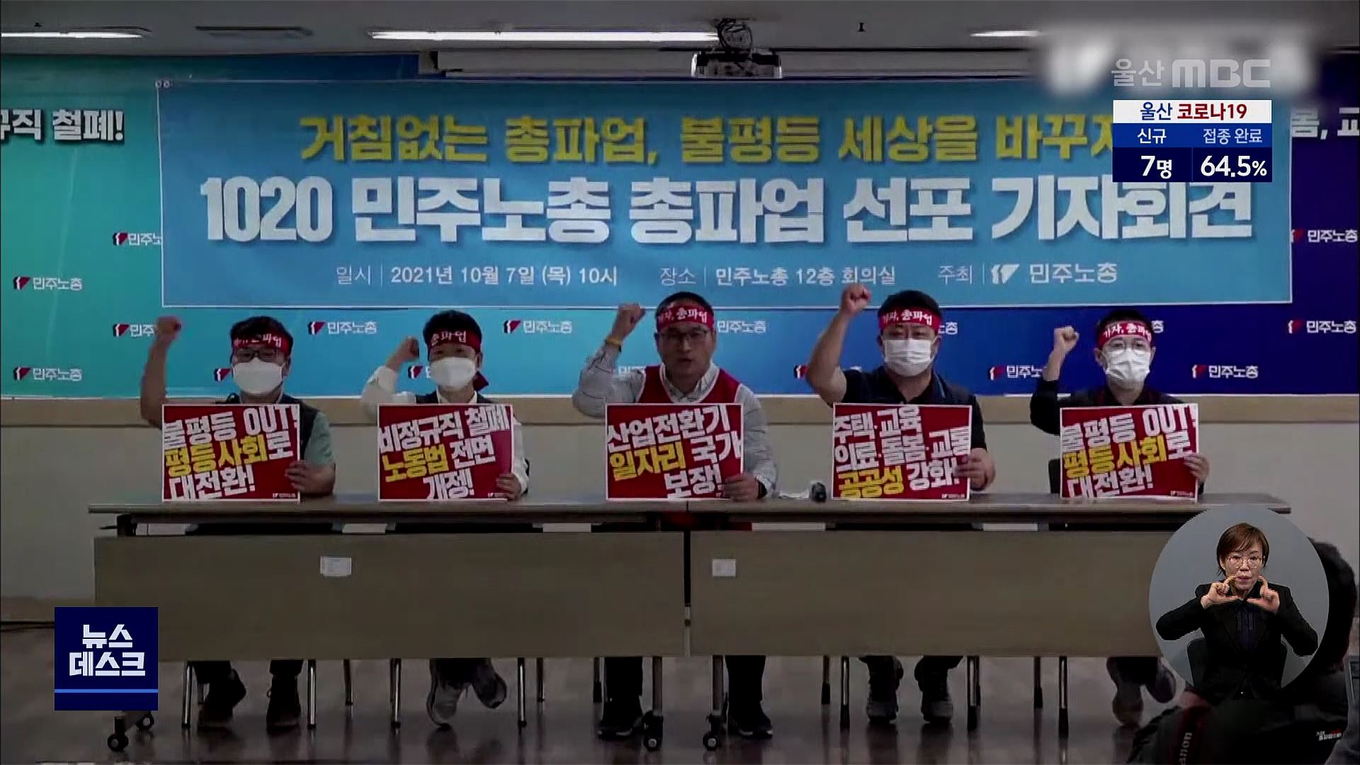 민주노총이 내일(10/20) 총파업을 예고한 가운데 울산에서도 학교 비정규직 노조 등이 파업에 참여할 것으로 보여 업무 차질이 불가피할 전망입니다. 민주노총은 내일(10/20) 태화강 고수부지 일대에 300명 규모로 총파업 관련 집회신고를 했으며 특히 학교 급식 조리원이나 돌봄 전담사 등도 파업 참여를 예고하고 나섰습...
