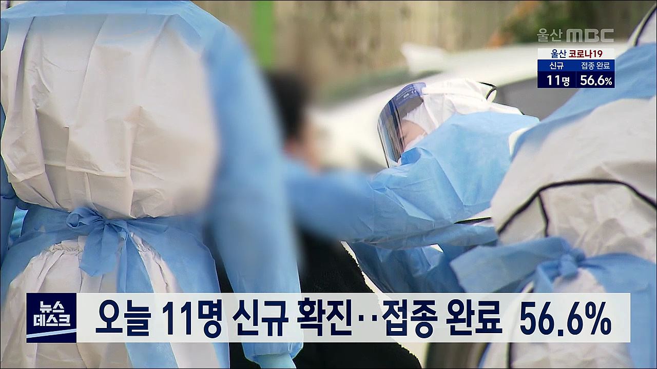 오늘(10/10) 울산에서는 코로나19 확진환자 11명이 추가로 나왔습니다. 6명은 기존 확진자와 접촉해 감염됐으며, 나머지 5명은 감염 경로를 조사하고 있습니다. 현재 울산 누적 확진자는 5천310명으로 늘었습니다. 오늘 오후 5시 기준 1차 접종을 마친 사람은 인구 대비 75.9% 접종 완료자는 56.6%인 것으로 집계됐습니다.