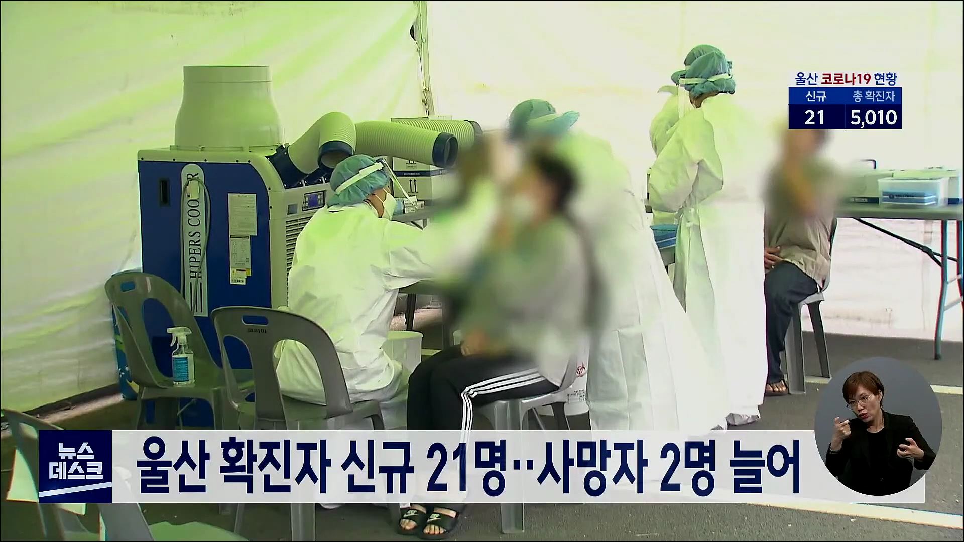 오늘(9/23) 울산에서는 코로나 확진자 21명이 추가로 나왔습니다. 이중 14명은 기존 확진자와 접촉해 양성 판정을 받았습니다. 현재 울산의 누적 확진자는 5천10명으로 늘었습니다. 한편, 어제와 오늘(9/23) 이틀 간 80대와 60대 등 사망자 2명이 나와 누적 사망자는 48명이 됐습니다.