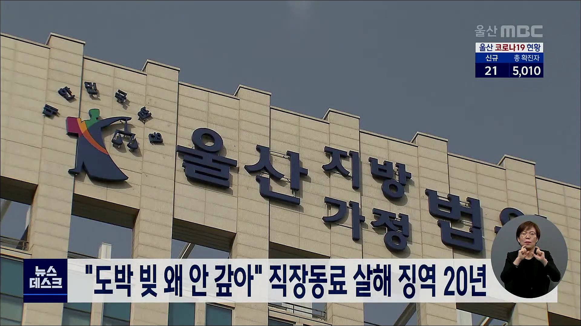울산지법 형사11부는 도박빚을 갚지 않은 직장 동료를 살해한 혐의로 기소된 50대 A씨에게 징역 20년을 선고했습니다. A씨는 지난 3월 북구의 한 주차장에서 도박 자금 1천150만 원을 빌려간 직장 동료를 흉기로 찌르고 방치해 숨지게 한 혐의로 재판에 넘겨졌습니다.//