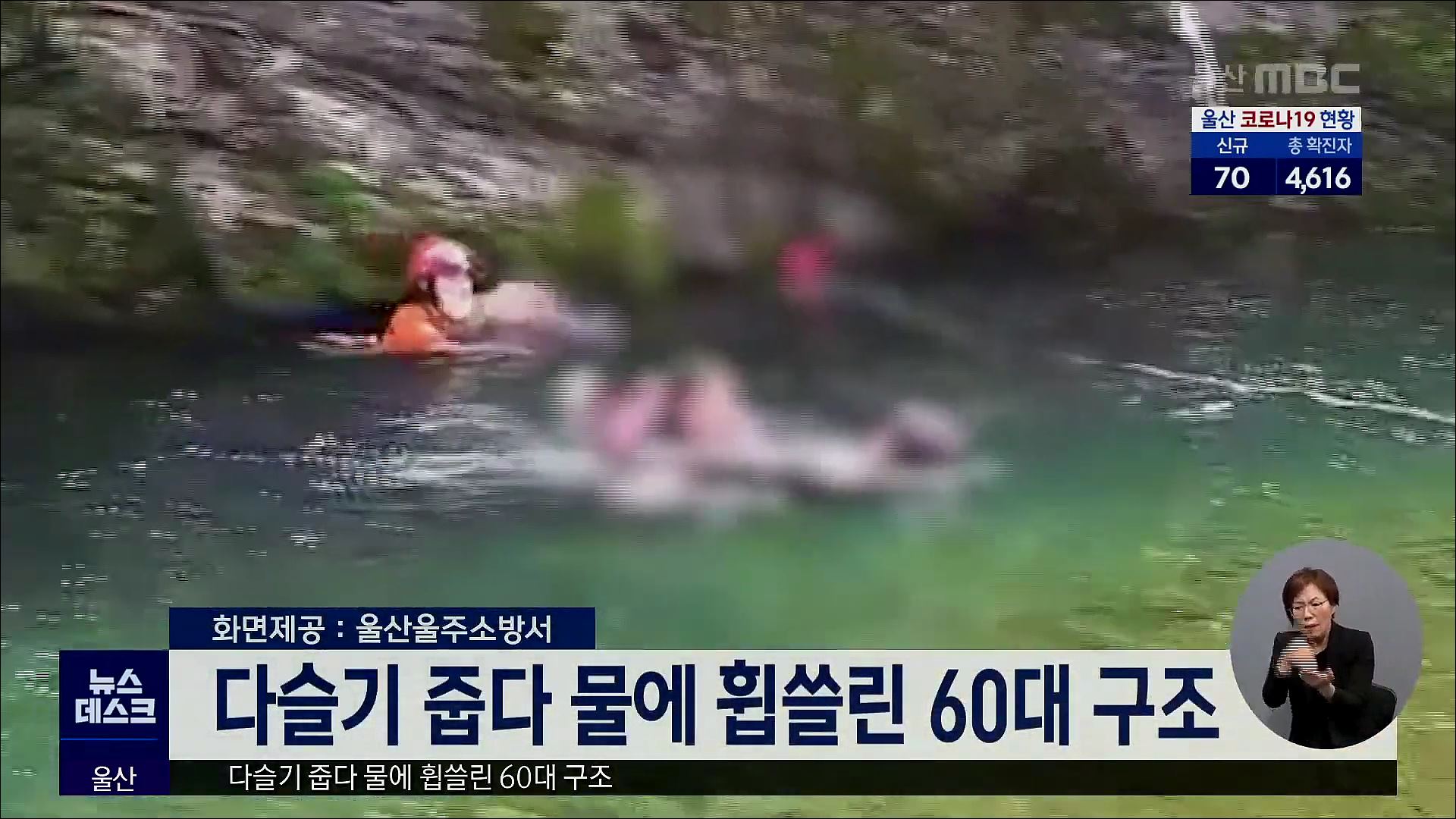 오늘(9/8) 오후 1시 20분쯤 울주군 삼남읍 산화리의 한 하천에서 60대 여성 A씨가 물에 휩쓸려 하천 바위에 매달려있다 구조됐습니다. 소방당국은 A씨가 다슬기를 줍다 수심이 깊어지자 물에 휩쓸린 것으로 보고 사고 발생 경위를 조사하고 있습니다. //