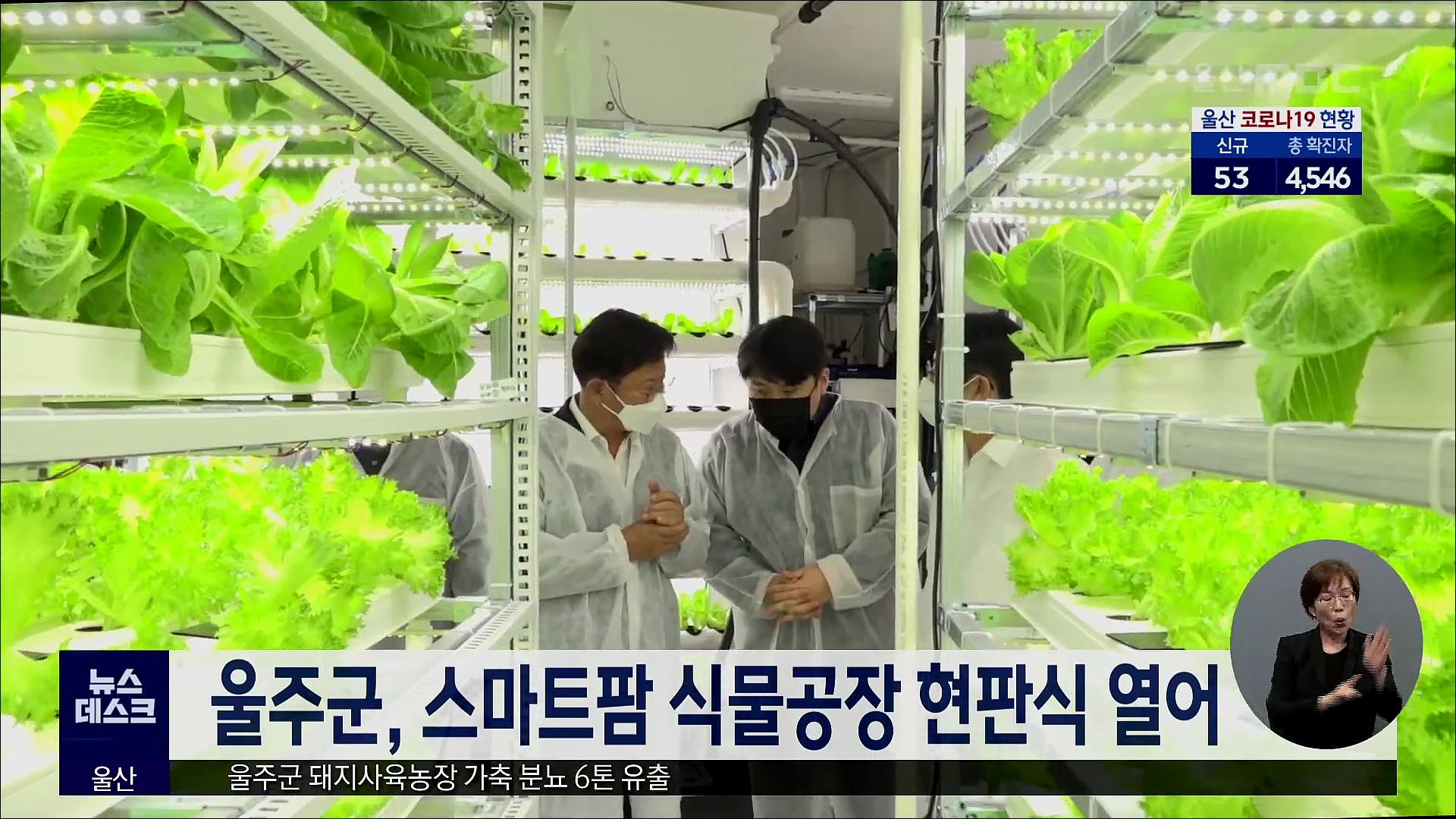 울주군 웅촌면 스마트팜에서 식물공장 '아워즈팜' 이 오늘(9/7) 현판식을 가졌습니다. 아워즈팜은 빛과 온도,수분을 조절해 최대의 생산성을 얻는 새로운 농업 방식을 적용했습니다. 아워즈팜은 로메인과 적근대, 바질 등 14종류의 식물을 재배해 연 1억 원 이상의 매출을 올릴 것으로 기대하고 있습니다. //