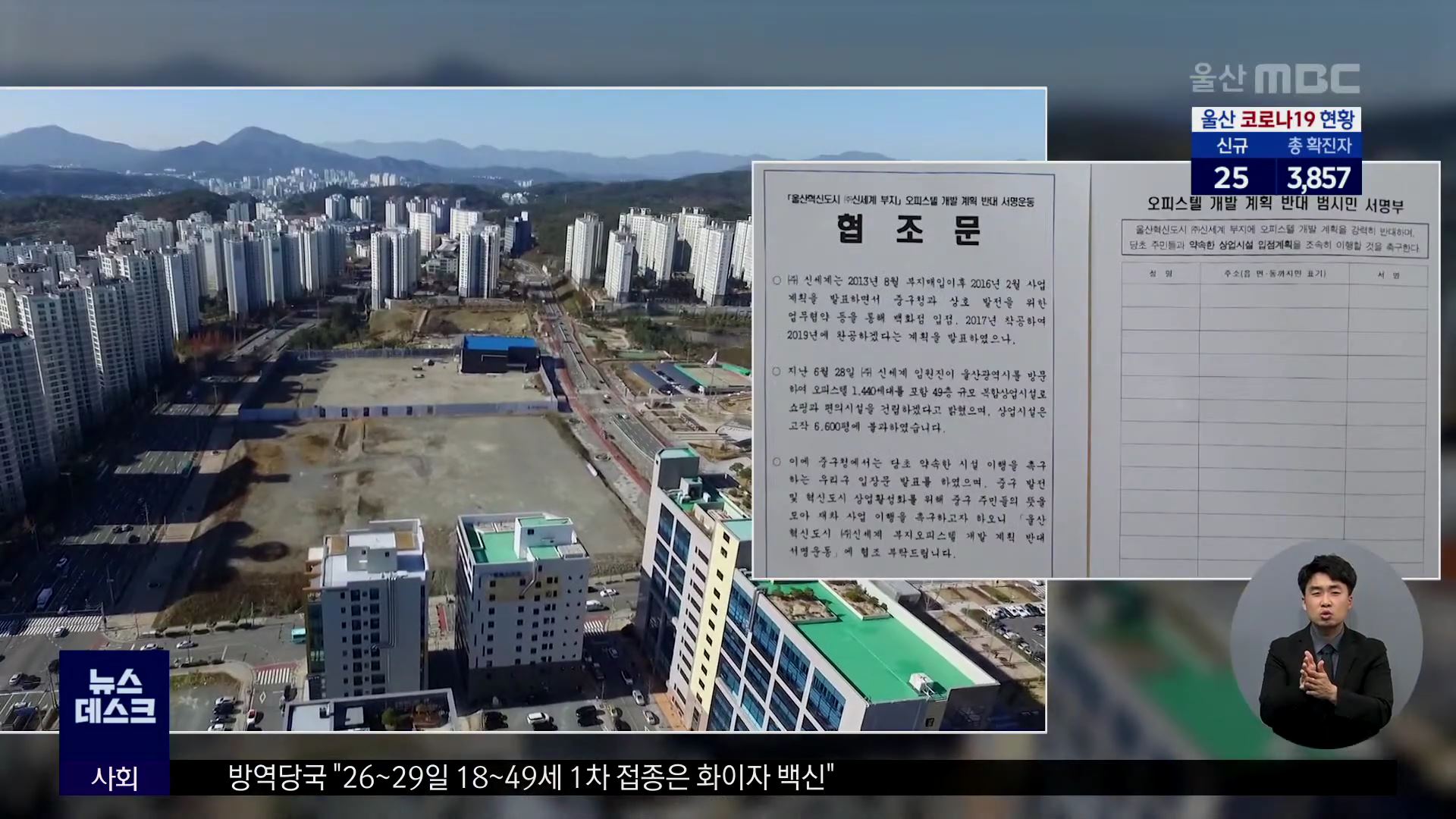 울산혁신도시 부지에 오피스텔을 건립하겠다는 신세계 개발 개획에 반대하는 시민 서명이 목표 2만 명을 달성했습니다. 이번 서명 운동에는 13개 행정복지센터, 혁신도시 공공기관과 공동주택 등이 참가했습니다. 중구는 조만간 신세계 본사를 방문해 상업시설 건립을 촉구할 계획입니다. //