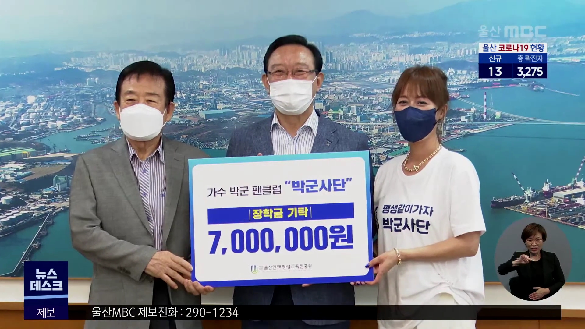 가수 박군 팬클럽 오늘(8/4) 울산시청을 찾아 장학금 700만 원을 전달합니다. 박군 팬클럽은 박군이 고향의 어려운 학생을 돕고 싶다는 말에 공감해 박군에게 커피차를 보내는 대신 장학금을 기부한다고 밝혔습니다. 팬클럽은 앞서 울산시교육청을 찾아 장학금 309만 원을 기부했습니다. //
