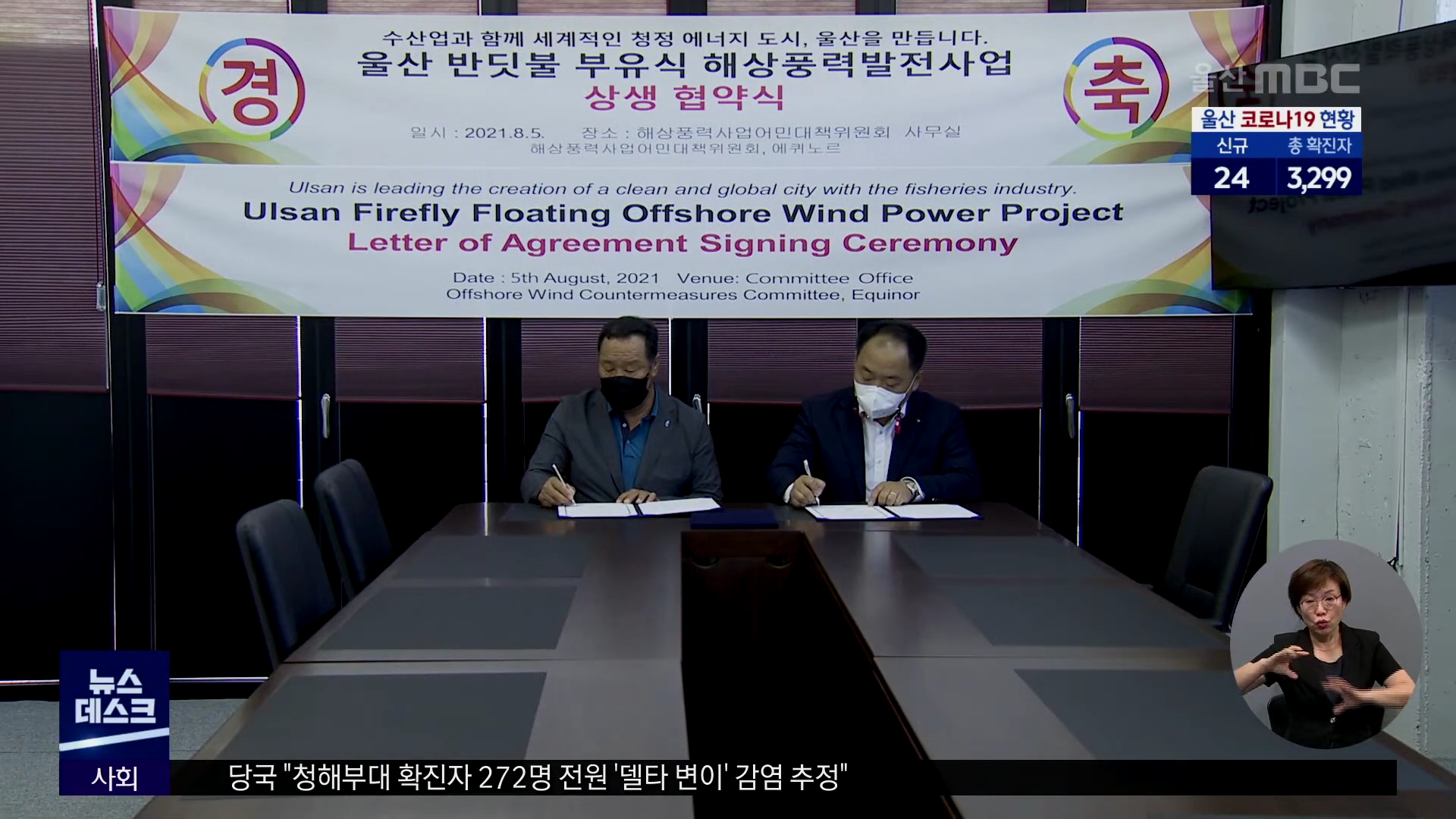 부유식 해상풍력 발전사업을 추진중인 노르웨이 국영기업 에퀴노르가 지역 어민단체와 상생협약을 맺었습니다. 이들은 협의체를 구성해 사업을 조속히 추진하고 발전 사업으로 인한 어업 피해를 보상하기 위해 노력하기로 합의했습니다. 이 사업은 에퀴노르가 울산항 동쪽 60km 해상에 800MW급 부유식 해상풍력단지를 조성...