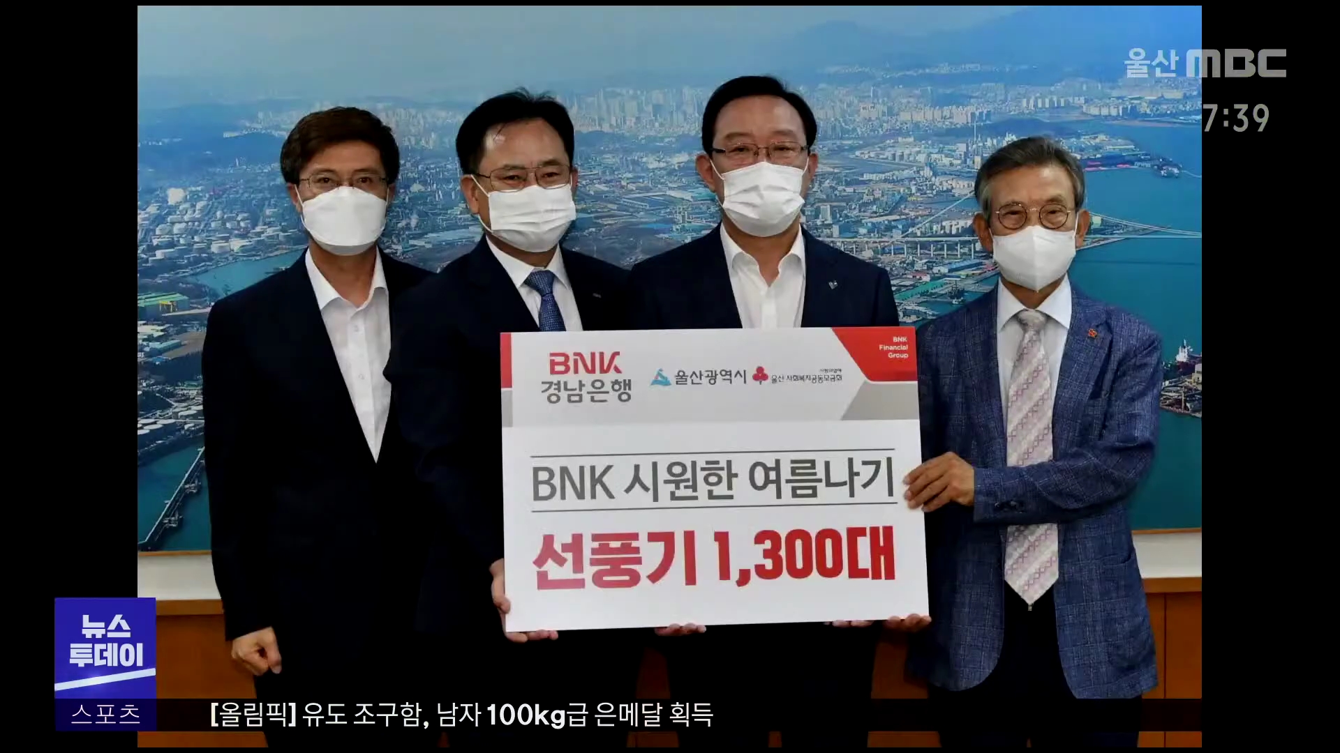 BNK경남은행이 울산지역 소외 계층에게 전달해 달라며 '시원한 여름나기 선풍기' 1,300대를 울산시에 기증했습니다. 울산시는 BNK경남은행이 기탁한 선풍기 1,300대를 울산사회복지공동모금회를 통해 저소득 가정과 복지사각지대에 지원할 예정입니다.//