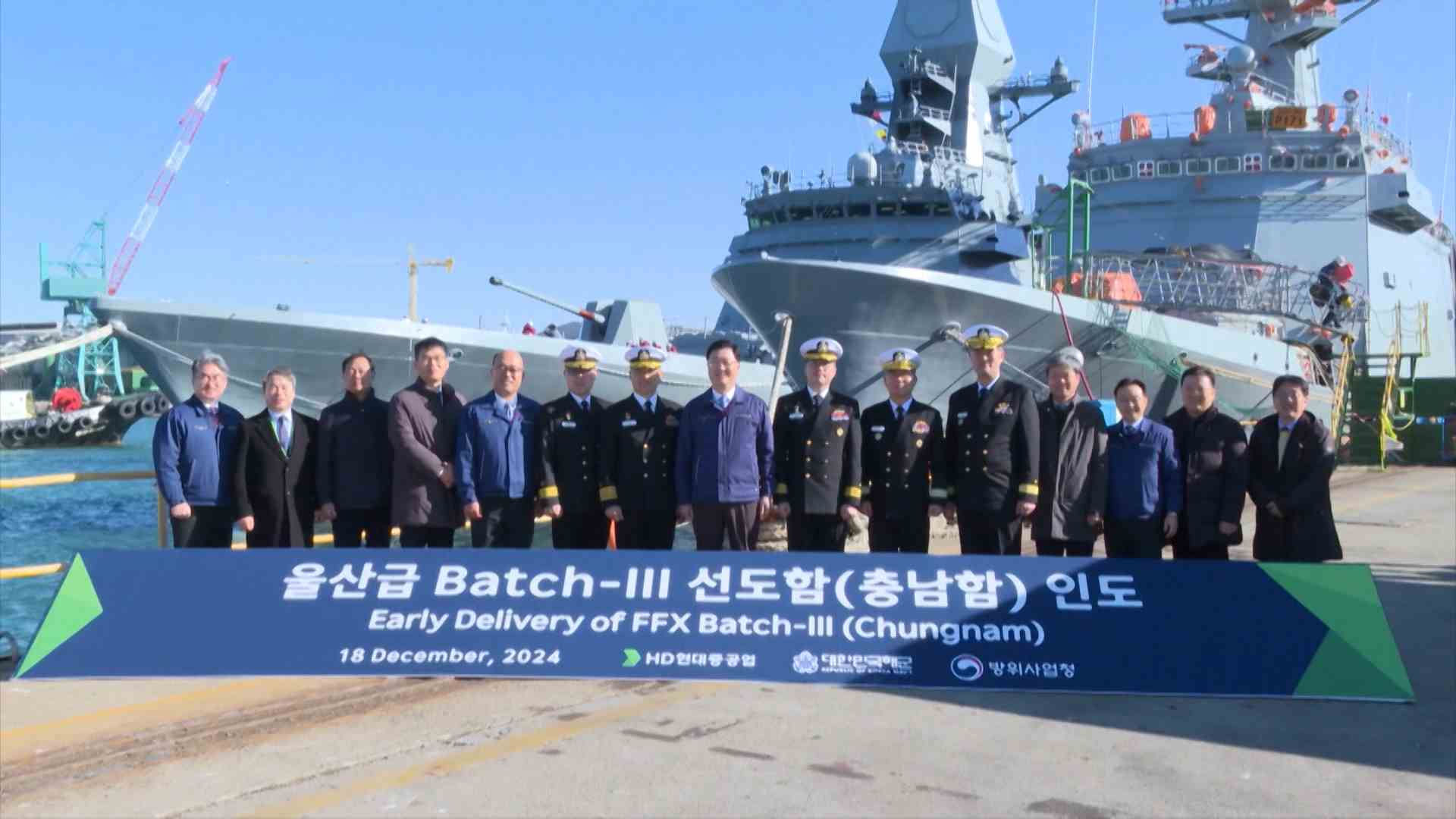 HD현대중공업이 차세대 이지스 구축함인 정조대왕함에 이어 최신예 호위함인 충남함을 오늘(12/18) 해군에 조기 인도했습니다. 충남함은 모두 6척의 3,600톤급 신형 호위함 가운데 첫 번째 다목적 전투함으로, 하이브리드 추진체계와 한국형 수직발사체를 탑재해 작전 수행 능력이 대폭 향상됐습니다. HD현대중공업은 앞서 ...
