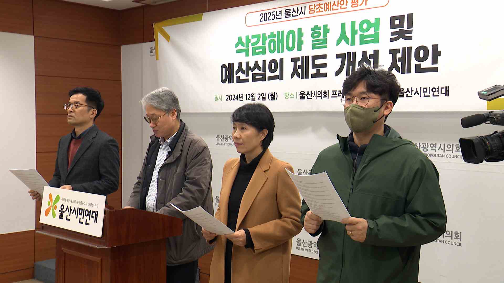 울산시민연대는 오늘(12/2) 시의회 프레스센터에서 기자회견을 열고 울산시가 예산을 삭감하거나 면밀히 검토해야 할 사업들을 제시했습니다. 시민연대는 93억 원이 투입되는 시청사 미디어파사드와 문수야구장 유스호스텔, 57억 원짜리 주차장 건립 등 8개 사업의 예산을 삭감해야 한다고 주장했습니다. 또, 여천매립장 파...