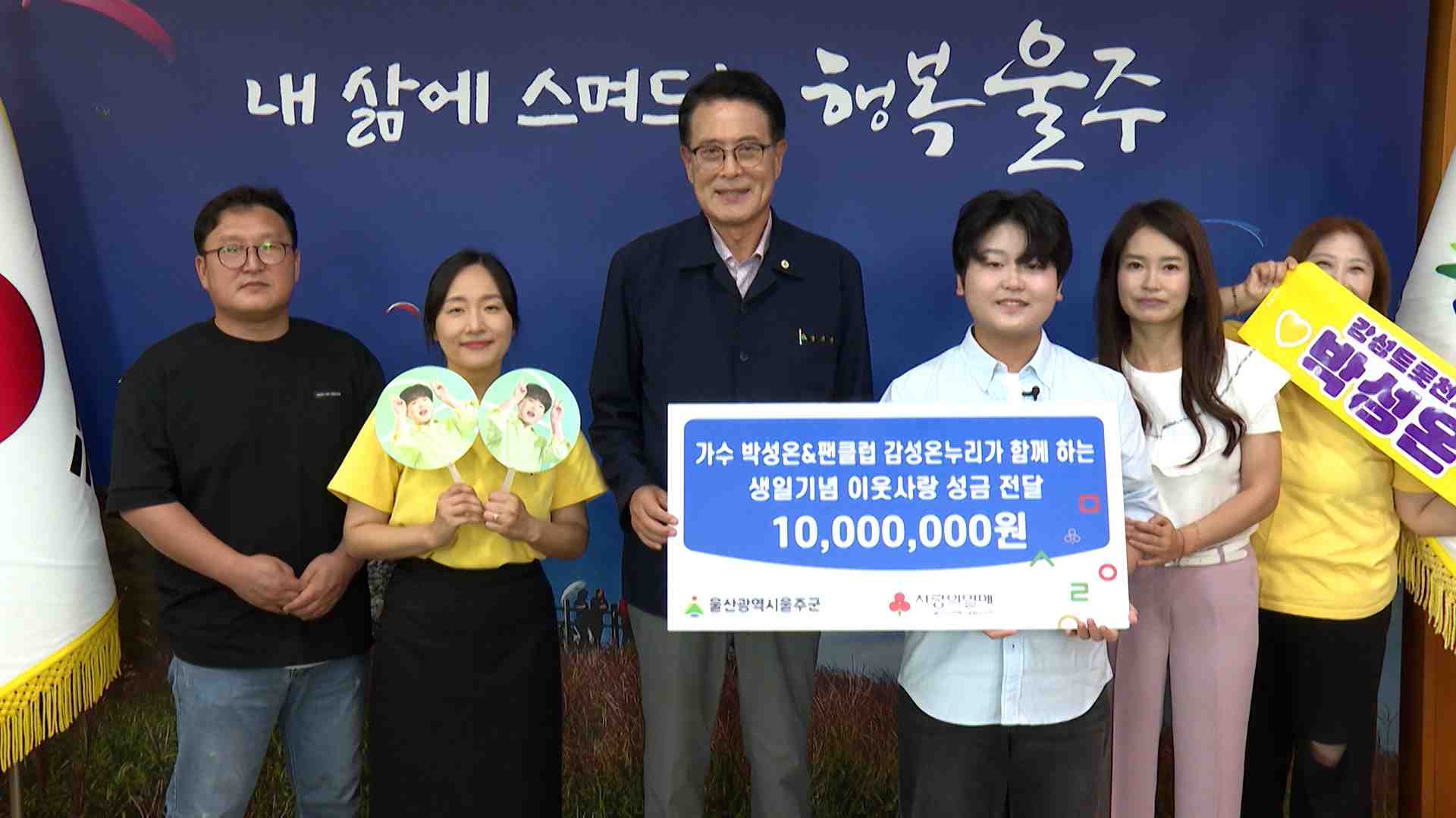 울산 출신의 트롯 가수 박성온과 팬클럽 회원들이 오늘(9/11) 울주군청을 찾아 성금 1천만 원을 기탁했습니다. 울주군은 지역 저소득 아동과 청소년 등을 위해 성금을 전달할 예정입니다. 박성온 군은 울주군의 한 중학교에 재학하면서 활발한 가수 활동을 펼치고 있습니다.
