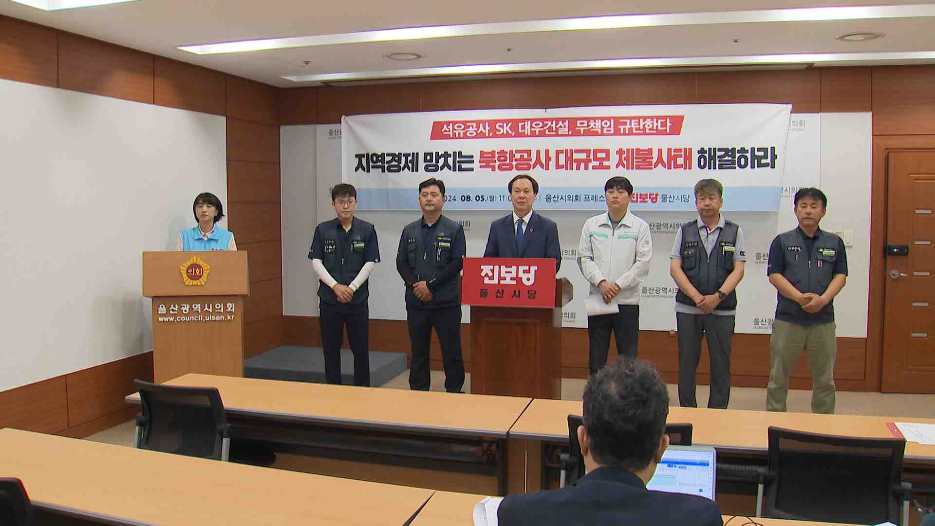 진보당 울산시당은 오늘(8/5) 기자회견을 열고 울산 북항 공사 현장에서 발생한 대규모 체불 사태에 대한 책임있는 해결을 촉구했습니다. 진보당은 집계된 체불 금액만 장비비 6억여 원, 자재비 4억여 원에 이르고, 피해업체가 30여개에 달하며 체불임금 피해자가 늘어나고 있다고 밝혔습니다. 그러면서 울산시와 관계부처...