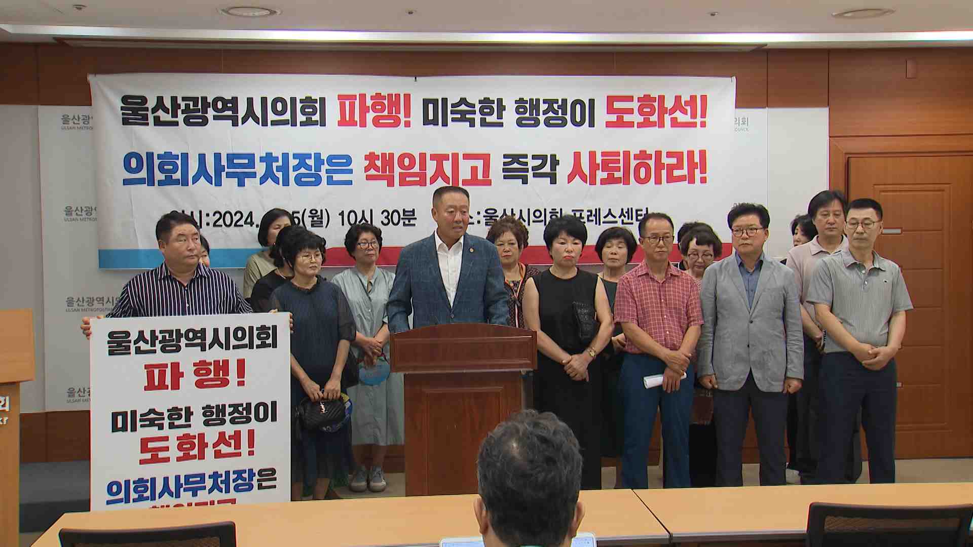 정의사회구현연대는 오늘(8/5) 울산시의회에서 기자회견을 열고 울산시의회 사무처의 미숙한 행정을 질타했습니다. 지역 봉사 단체라고 밝힌 이들은 시의회 파행 책임이 의회사무처의 일처리 때문이라며 검표를 담당한 공무원을 징계하고 사무처장은 스스로 사퇴해야 한다고 주장했습니다.