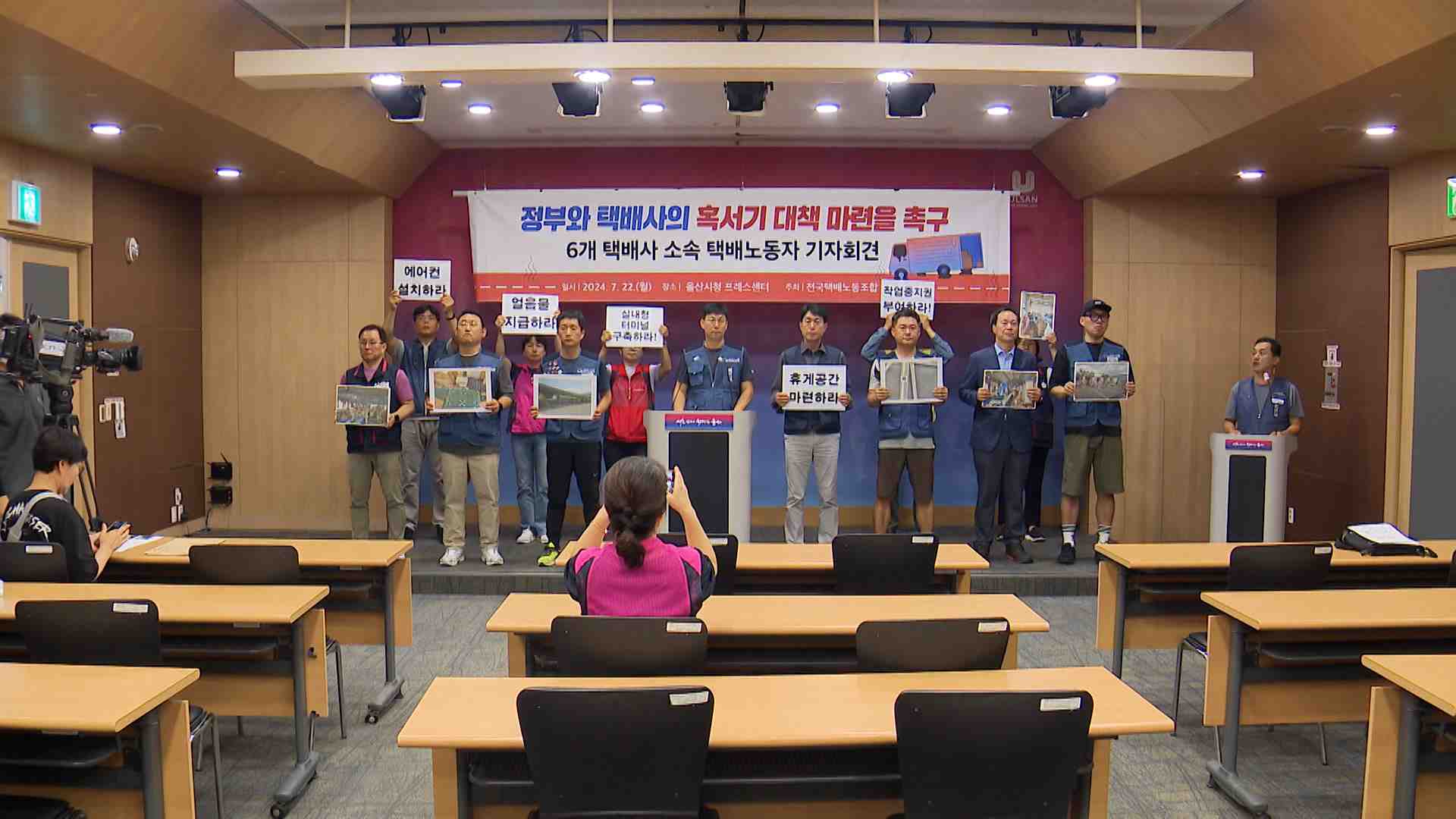 전국택배노동조합 울산지부는 오늘(7/22) 울산시청 프레스센터에서 혹서기 대책을 마련하는 기자회견을 열었습니다. 노조는 여름철에 택배 터미널 시설의 실내 온도가 40도를 오르내리지만 선풍기에만 의존해서 작업해 폭염 위험에 노출돼 있다며, 노상에 지붕만 설치한 형태의 택배터미널을 실내형으로 변경하고 공장형 에...
