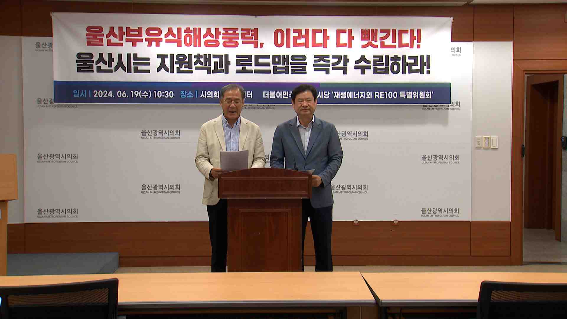 더불어민주당 울산시당 재생에너지 특별위원회는 오늘(6/19) 시의회에서 기자회견을 열고 울산부유식해상풍력 사업의 조속한 추진을 촉구했습니다. 이들은 현 집행부 출범 이후 부유식해상풍력 사업이 외면받아 세계적 터빈 회사인 베스타스의 공장 건설은 목포로, 현대중공업의 부유체 제작은 군산으로 계획이 변경됐다고 ...