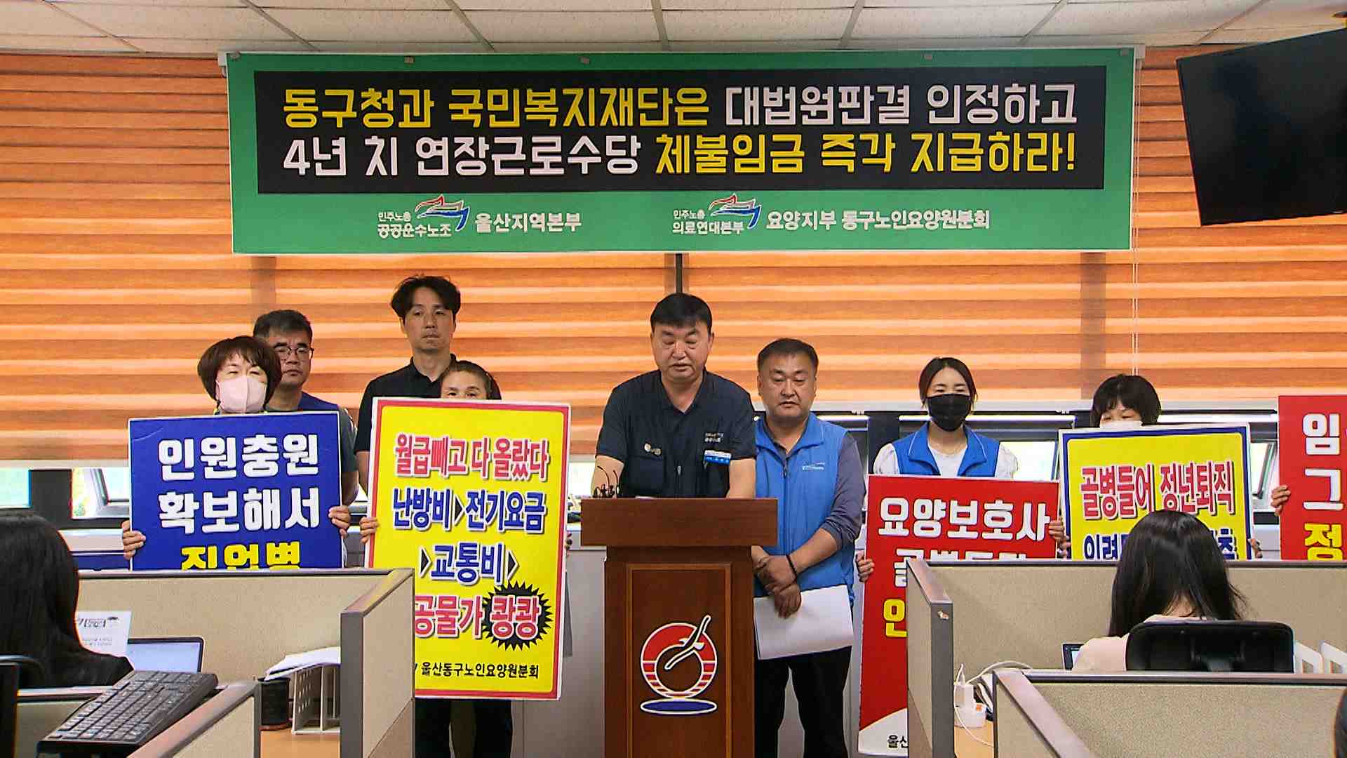 동구노인요양원 요양보호사 등 10명이 오늘(5/29) 동구청에서 기자회견을 열고 체불된 연장근로수당 지급을 촉구했습니다.이들은 대법원이 연장근로수당 미지급에 대한 미필적 고의를 인정하고 벌금형을 확정한 만큼 체불된 7천4백만 원을 지급하라고 주장했습니다. 이에 대해 요양원은 임금체불과 관련해 진행 중인 민사 ...