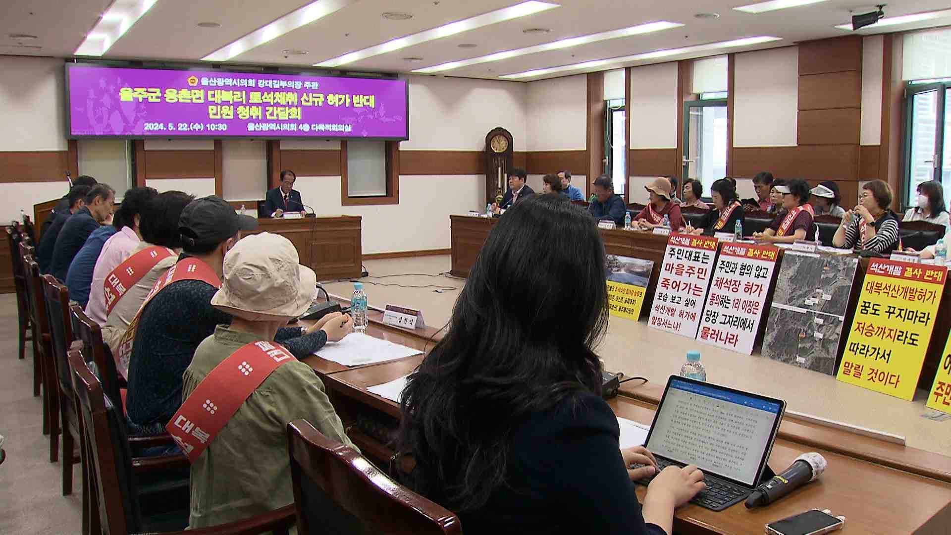 울주군 웅촌면 일대에 채석장이 조성되는 사안과 관련해 강대길 울산시의원과 반대 주민 위원회, 시청 공무원이 참석해 간담회를 진행했습니다. 주민들은 이 자리에서 사업 예정 부지 반경 2km 안에 학교들이 자리잡고 있고 웅촌면 주민의 70% 이상이 거주하고 있다며, 주민들의 피해를 외면하지 말아달라고 주장했습니다. ...