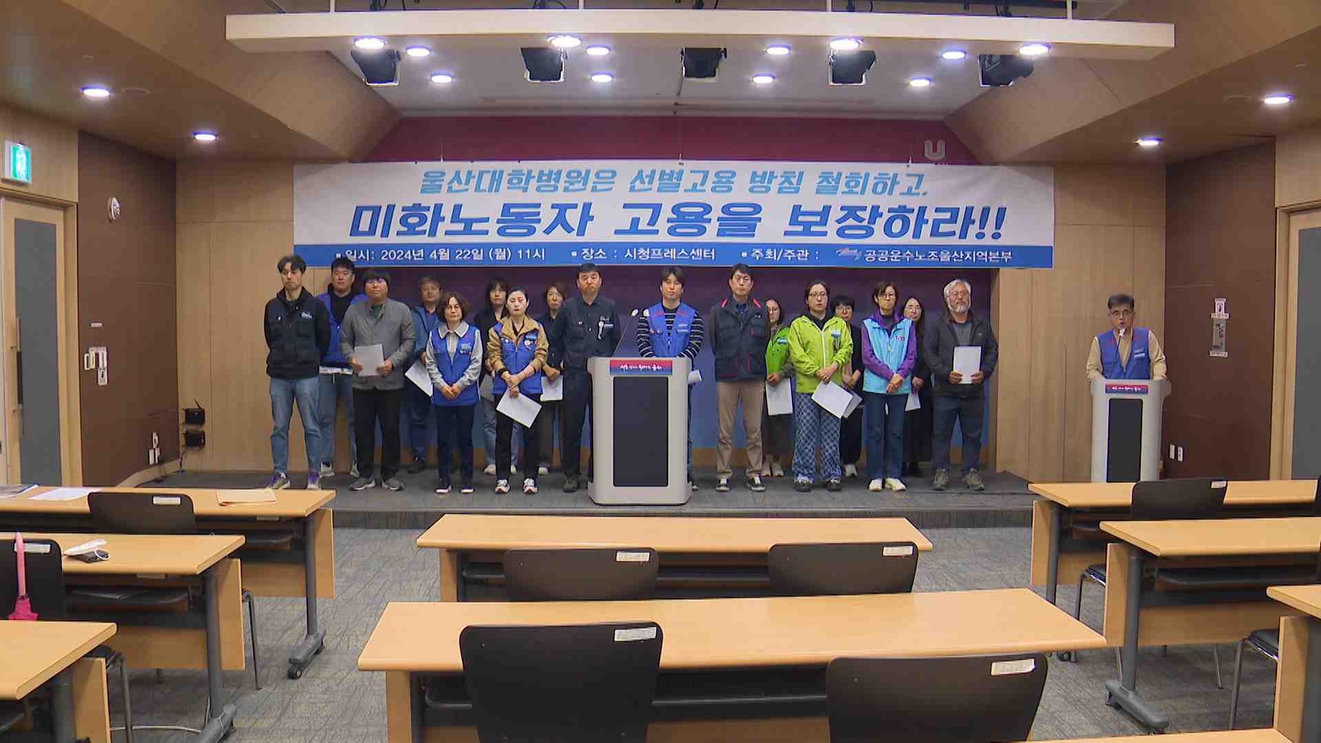 지역 노동계가 울산대병원에 병원 미화 노동자의 고용 안정을 보장하겠다는 약속을 지키라고 요구했습니다. 이들은 오늘(4/22) 기자회견을 열고, 병원 측이 지난해 1월부터 용역업체 소속인 미화 노동자들에 대한 특별 교섭을 진행하겠다고 했지만, 현재까지 논의는 4차례뿐이었고 그마저도 노동조합의 의견을 무시한 채 병...
