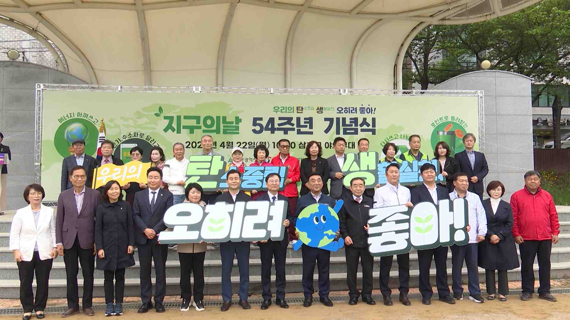 54회 지구의날 기념 행사가 오늘(4/22) 오전 삼호교 야외무대에서 열렸습니다. 지구의날은 환경보호 실천을 유도하는 시민사회 운동으로, 지속 가능한 발전을 위한 퍼포먼스와 걷기 행진 등의 부대 행사가 진행됐습니다. 지역 공공기관들은 탄소 절감을 다짐하는 서약과 사무실 일제 소등을 통해 지구의날 행사에 동참했습...