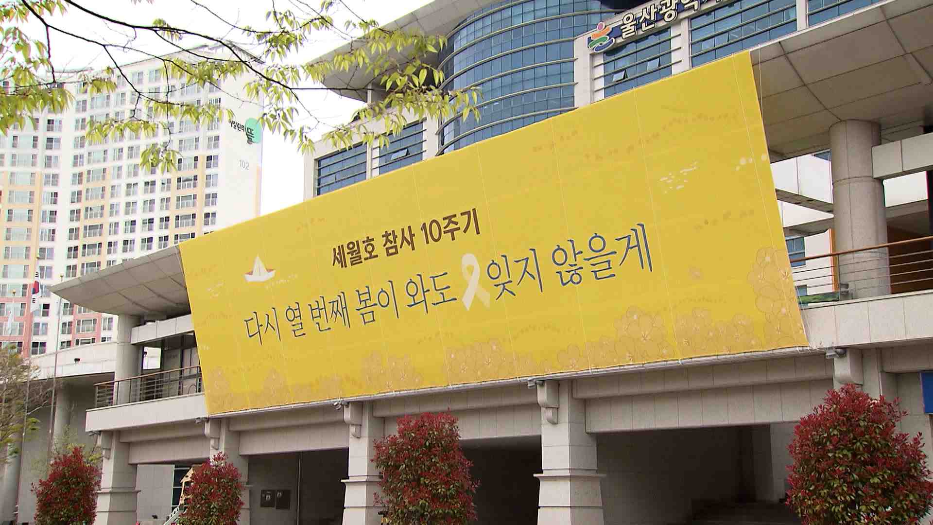 세월호 참사 10주년을 맞아 울산교육청이 오늘(4/11)부터 오는 16일까지 희생자 추모 행사를 마련했습니다. 울산교육청은 청사 바깥벽에 세월호 희생자를 추모하는 대형 펼침막을 걸었고 1층 로비에 세월호 기억 작품 전시회를 열었습니다. 또 사고 발생일인 16일에는 추모 묵념행사를 가지고 일선 학교에서는 이달 30일까...