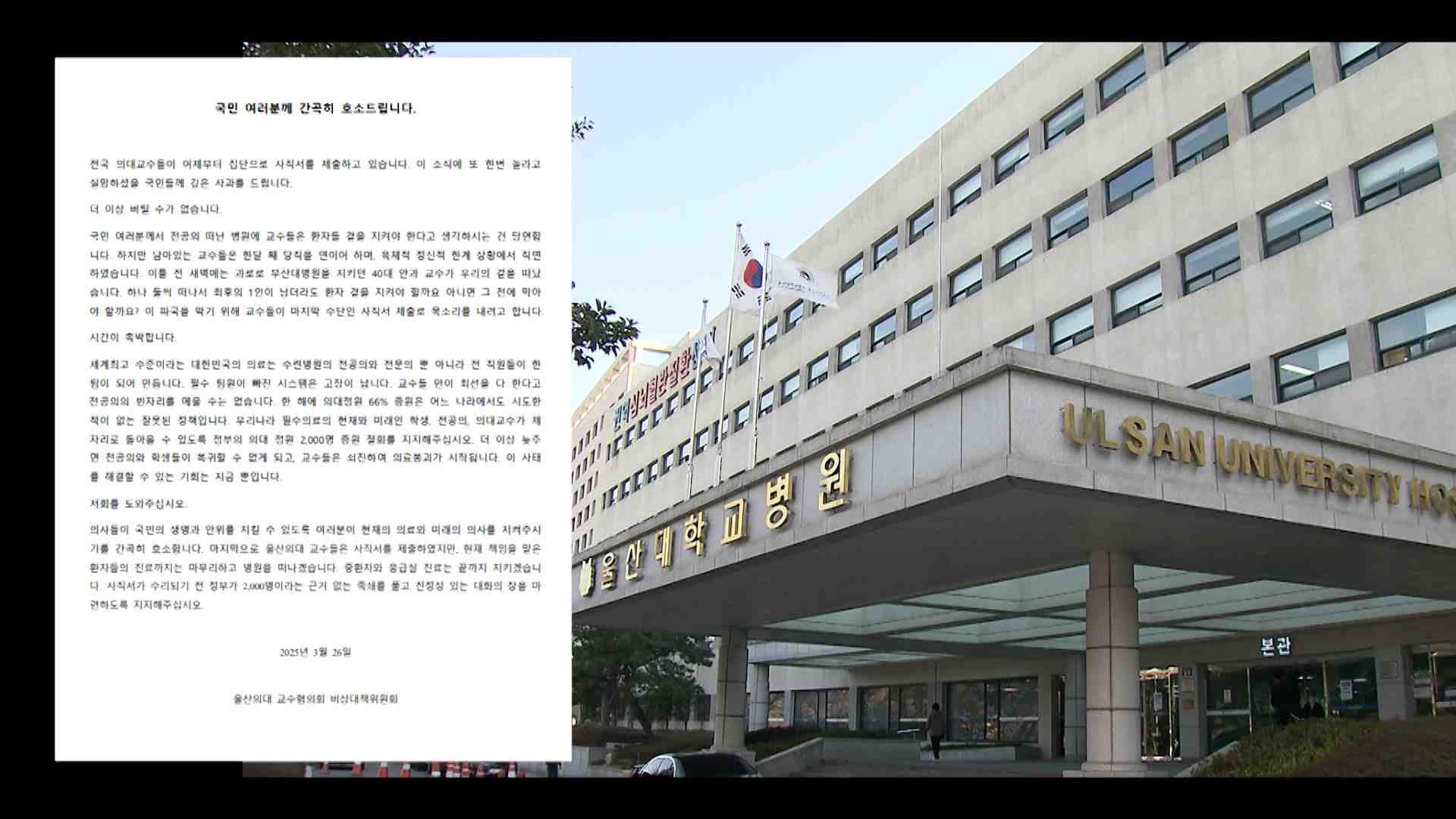울산의대 교수들이 대국민 호소문을 통해 사직서 수리 전 정부가 의대 정원 2천명 증원 방침을 철회하고 대화의 장을 마련하게 해달라며 국민들의 지지를 호소했습니다. 울산의대 교수협의회 비상대책위는 국민들이 교수들은 환자 곁을 지켜야한다고 생각하시는건 당연하다면서도 과로로 부산대병원 교수가 숨지는 등 육체...